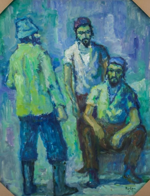 Oil on canvas, framed. Featuring portrait of three men sitting and standing around. Signed "Rodan"to the bottom right corner. Canvas size: 65 x 52 cm (25.5 x 20.5 inches). Frame size: 69 x 56 cm (27.5 x 22 inches).
