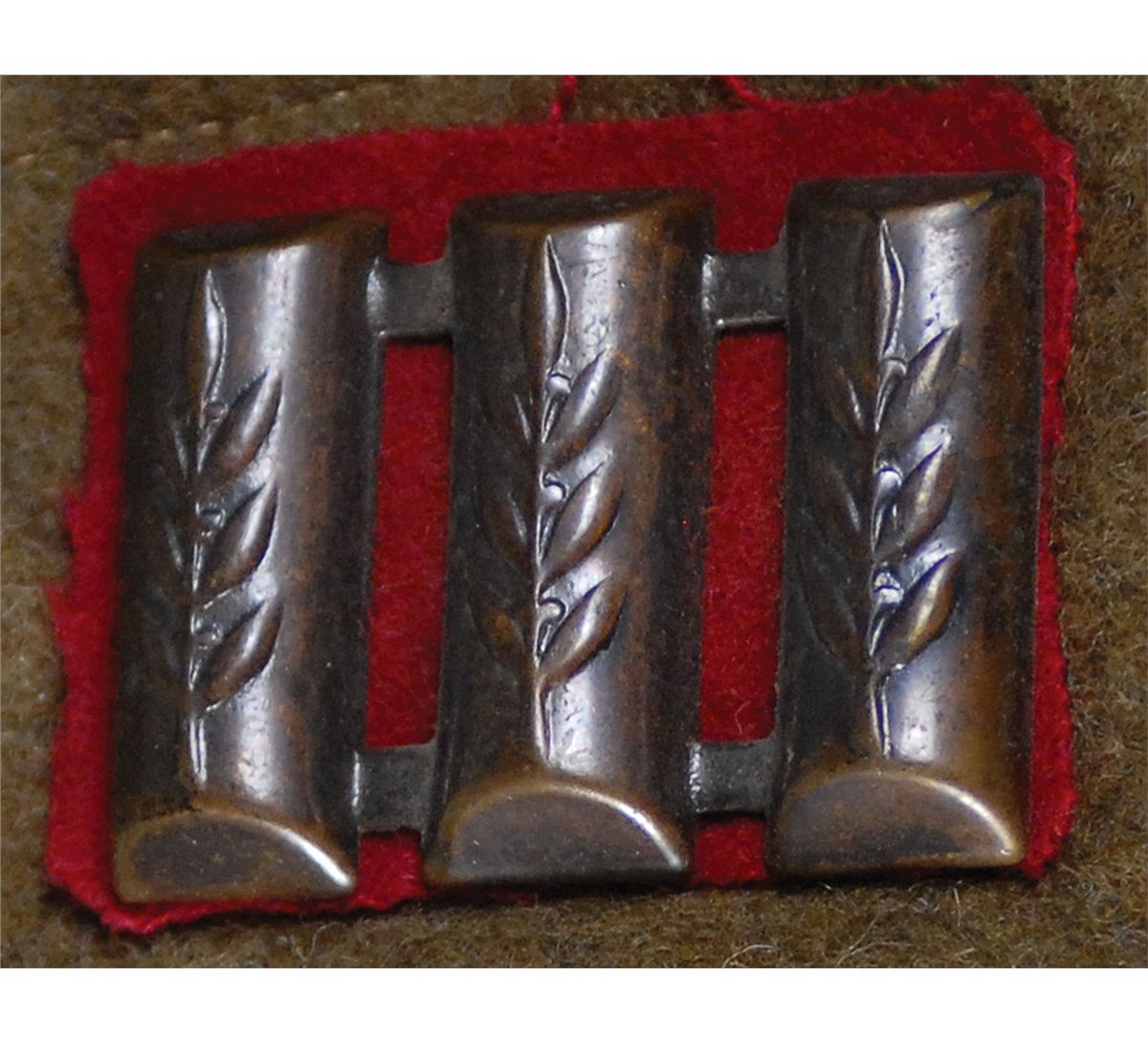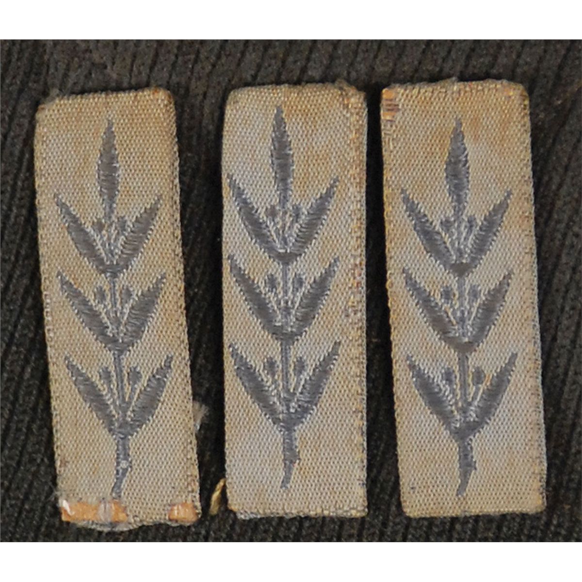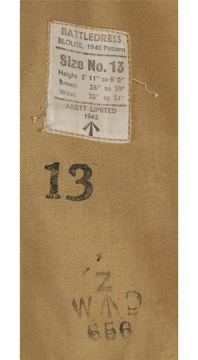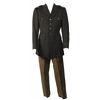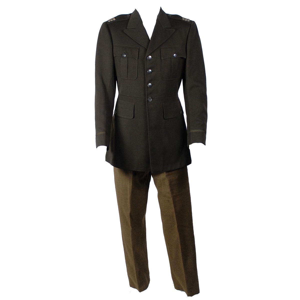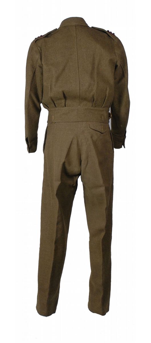 Zahal military uniform issued to and worn by David Leshem, son-in-law of Israeli Prime Minister David Ben-Gurion. Olive green service uniform consists of a wool dress jacket and matching shirt and pants from his officer’s working uniform. Jacket has three 0.5 x 1.25 bars, each with an olive branch, embroidered and affixed to each shoulder, with two chest pockets and two lower pockets, each with pocket flaps. Letters and numbers are penned inside the right sleeve. The wool battle-dress shirt has two chest pockets with pocket flaps, a long waist belt secured by a roller-type buckle, wrist cuffs which can be unbuttoned, and buttons and metal hooks at the throat closure. The label sewn inside is imprinted: "Battledress/Blouse, 1940 Pattern/Size No. 13/Height 5'11? to 6' 0?/Breast 38? to 39?/Waist 33? to 34?/Akett Limited/1945." Battledress shirts of this type first became general issue to all British Royal Air Force personnel in 1943. Three metal bars connected to each other, each depicting an olive branch, are mounted on a 1.75 x 1.25 red cloth and are affixed to each shoulder of the blouse. Pants are labeled “8” inside, and there are two pockets with flaps, one on the left thigh and one on the right buttocks, and one buttoned pocket on the right thigh, with a six button fly. In overall fine condition. Ben-Gurion’s leadership during the 1948 Arab-Israeli War, including the formation of the Israeli Defense Forces, led to his overwhelming appointment as Prime Minister, a position he held until 1963, except for a two-year period. Early Israeli uniforms are seldom offered for sale; this one is made even more desirable and historically significant by the fact that it and belonged to and was worn by Ben-Gurion's son-in-law.