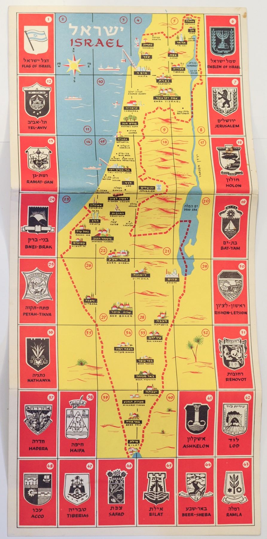 Israeli boardgame board by Bar Levi, quality color print upon cardboard, belong to the game 'Israel and it's cities', good condition: stain on the Holon city symbol. Dimensions: 28x60 cm.