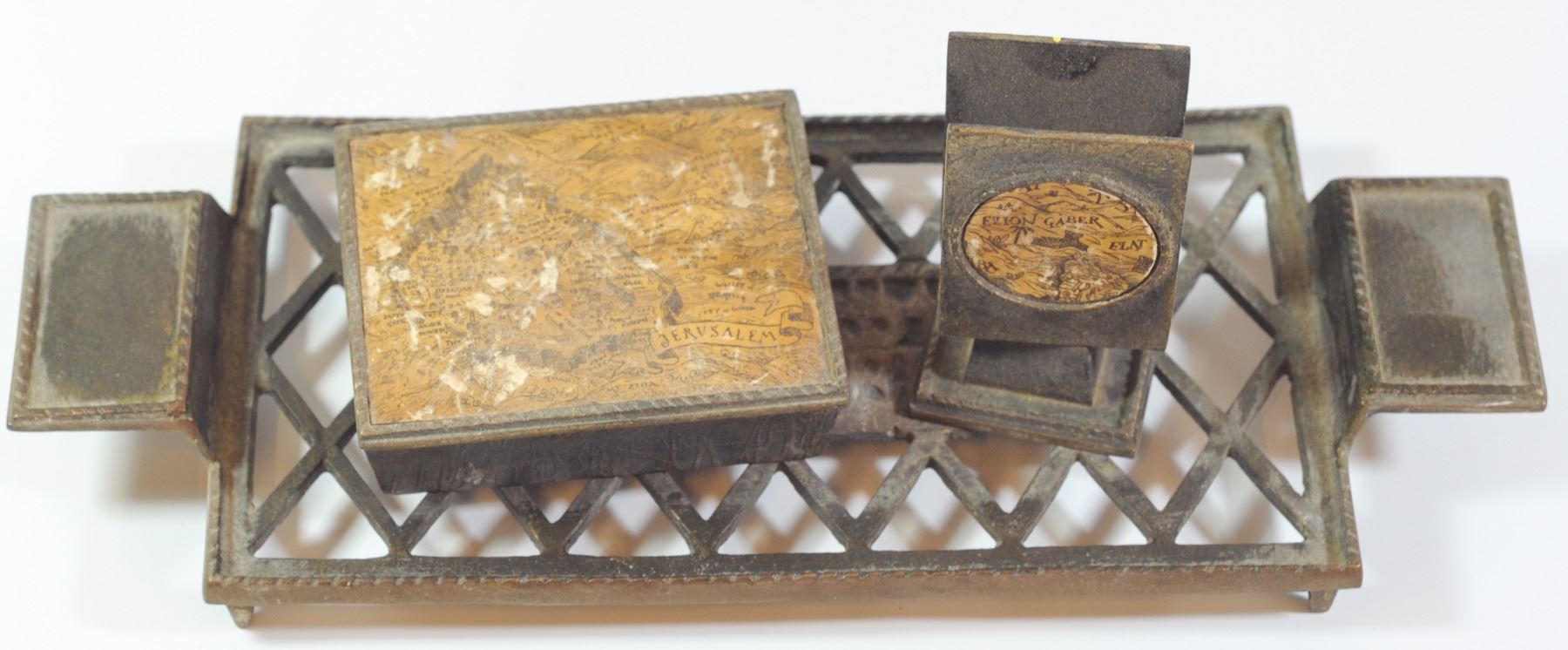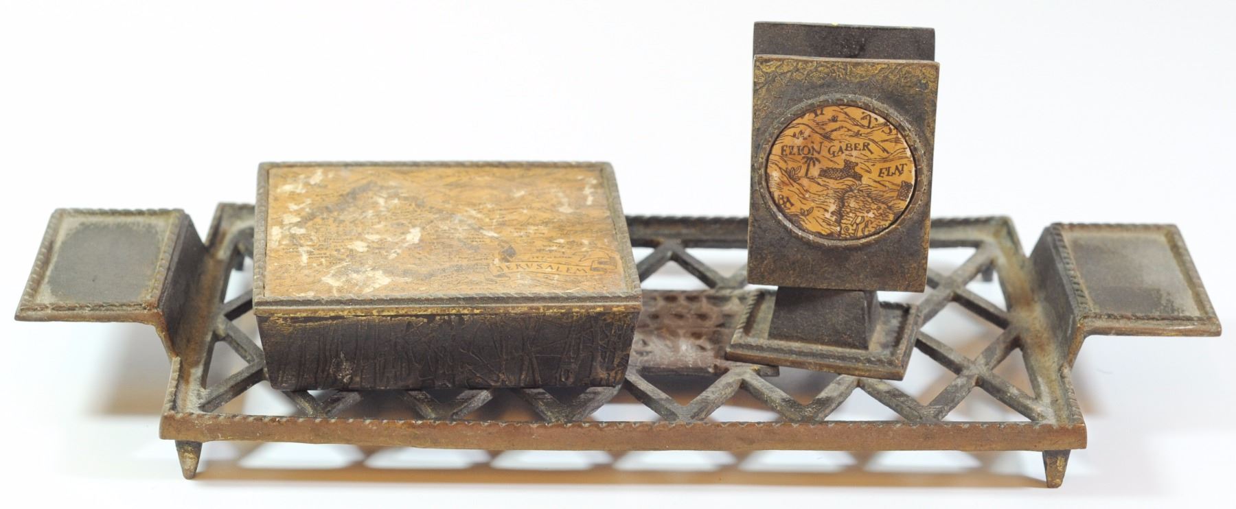 Israeli table smoking kit by Nordia: matchbox holder, box and tray. The matchbox and box are embellished with prints of ancient maps. Flaws in prints. Tray is signed. Length of tray: 24.5 cm.