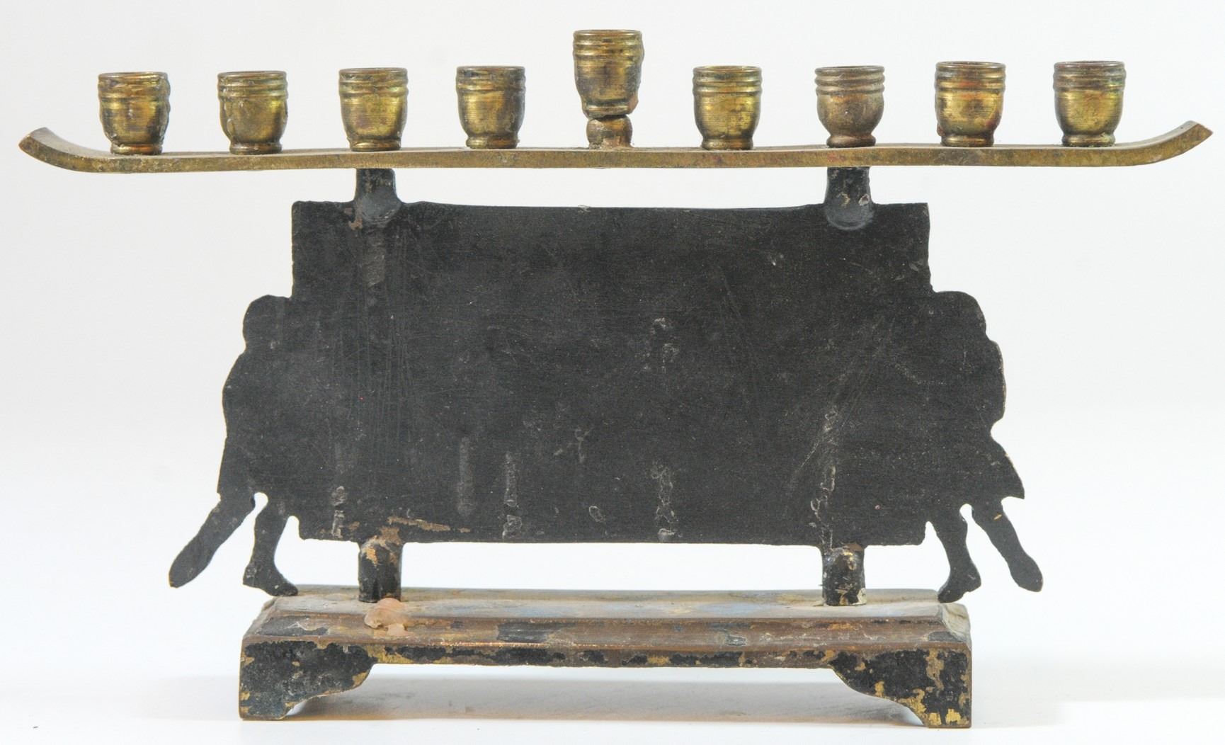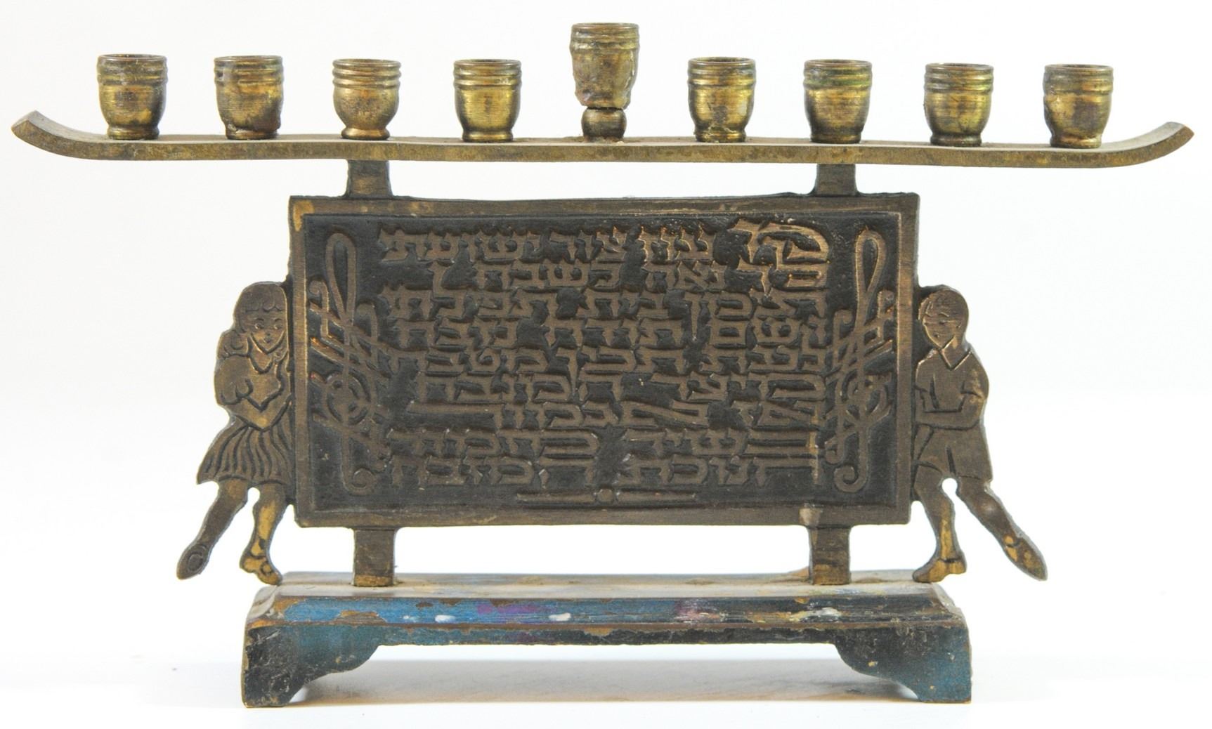 Israeli upright Hanukkah menorah lamp by Hakuli, decorated with two children standing next to a board with a relief inscription reading 'Ma Oz Zur', blue patina base, worn patina, signed, length: 20 cm.