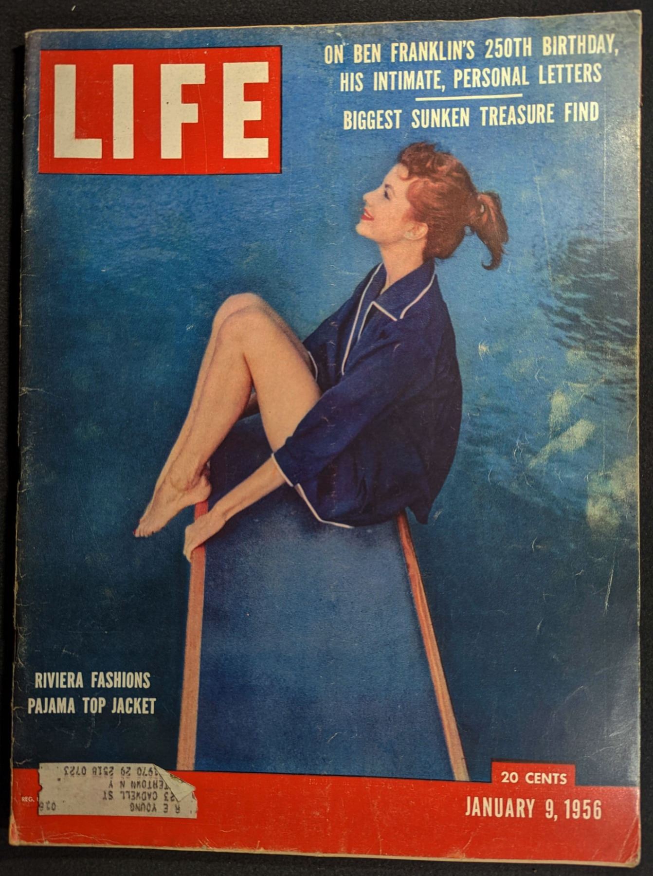 ISSUE OF LIFE MAGAZINE. JANUARY 9, 1956. TIME, Inc. fo. Chicago. original pictorial paper wraps. illustrated. Very Good. January 9, 1956, Volume 40 No. 2. Includes the article, 'Richest Treasure Trove. A Bermuda Skindiver Discovers Sunken Bonanza 300 Years Old'. pp 38-40, 42, 44, 46. An article about treasure salvage pioneer Teddy Tucker and finds he made diving off Bermuda. Lot weight: 0 lbs 15oz. Subject(s): Sunken Treasure.