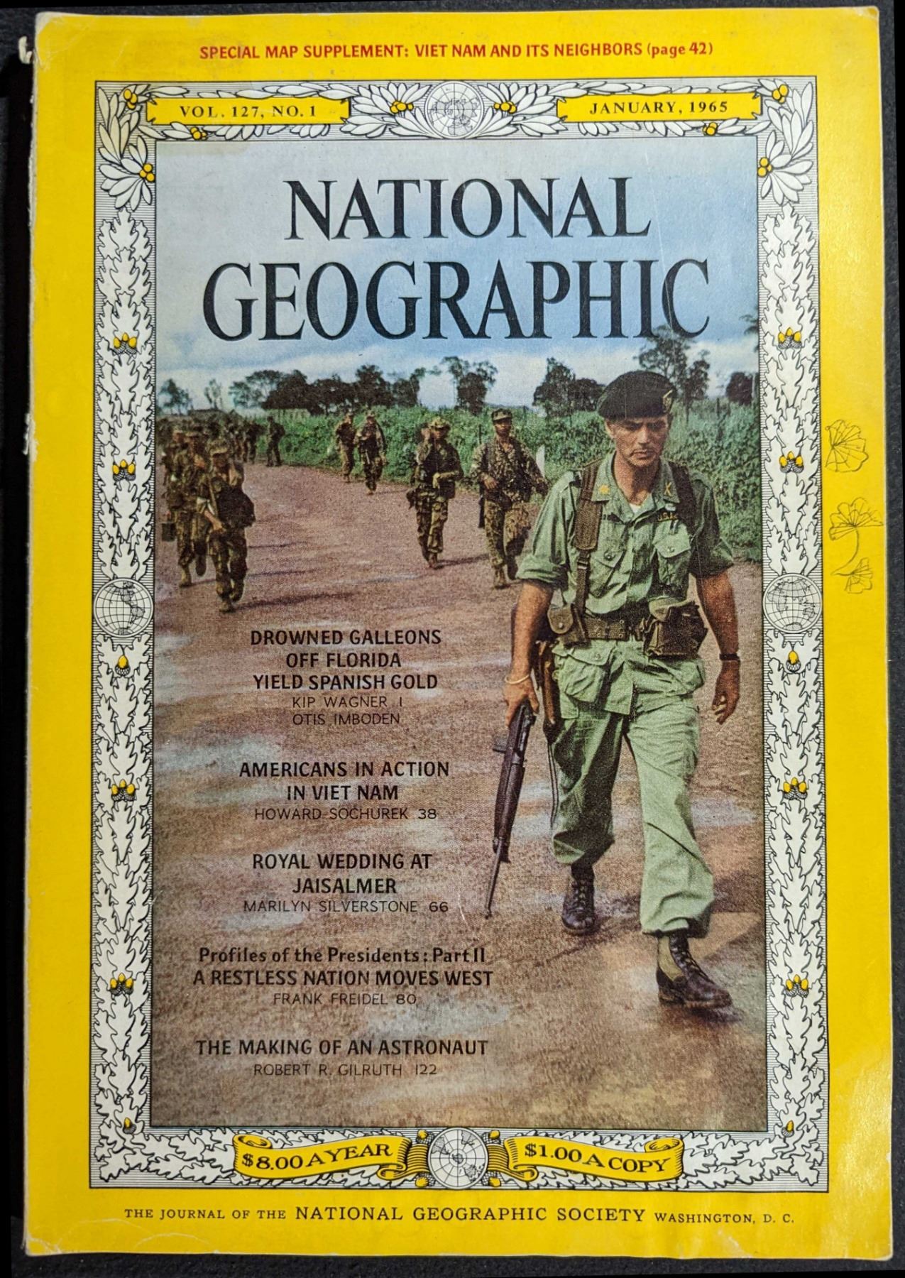 Wagner, Kip. ISSUE OF NATIONAL GEORGRAPHIC. JANUARY, 1965. The National Geographic Society. 4to. Washington D.C. original pictorial card wraps. illustrated. Very Good. January, 1965, Volume 127 No. 1. Includes the article, 'Drowned Galleons Yield Spanish Gold' by Kip Wagner. pp 1-37. An article about Kip Wagner and the Real Eight Company and their treasure salvage of the 1715 Spanish Plate Fleet wrecks. Lot weight: 0 lbs 12oz. Subject(s): Sunken Treasure.