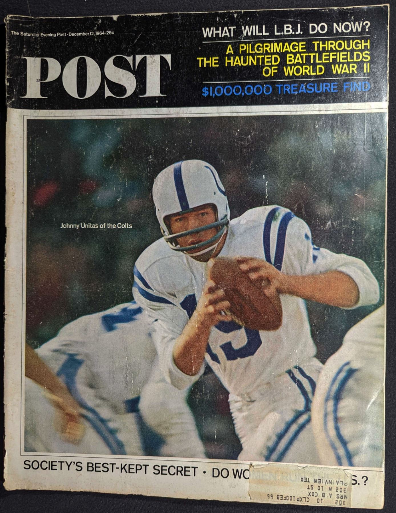 Atwater, James. ISSUE OF SATURDAY EVENING POST. DECEMBER 12, 1964. The Curtis Publishing Company. fo. Philadelphia. original pictorial paper wraps, tear along spine. illustrated. near Very Good. December 12, 1964, Volume 237 No. 44. Includes the article, 'Spanish Gold Two Fathoms Deep' by James Atwater. pp 66-71. An article about treasure salvage on the 1715 Fleet. Mentioned are treasure salavge pioneers: Mel Fisher, Mo Molinar, and Kip Wagner. Lot weight: 0 lbs 10oz. Subject(s): Sunken Treasure.