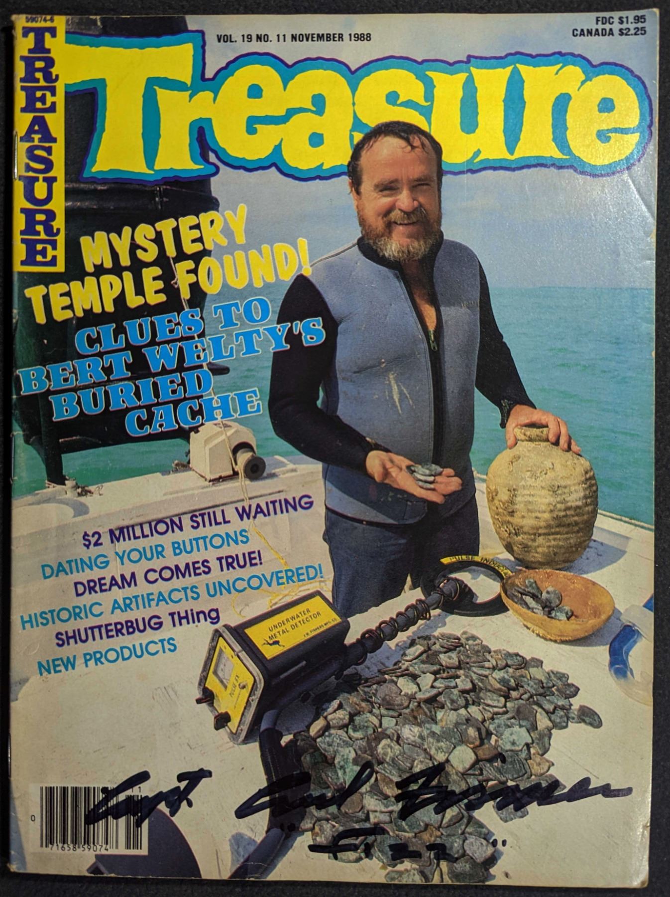 Fismer, Capt. Carl 'Fizz' and V.A. Music. ISSUE OF TREASURE SIGNED BY CAPT. CARL 'FIZZ' FISMER. NOVEMBER 1988. Jess Publishing Company, Inc. 4to. Twentynine Palms. original pictorial paper wraps. illustrated. Fine. November, 1988, Volume 19 No. 11. Includes the article, '12 Year Search for Mystery Temple' by Capt. Carl 'Fizz' Fismer and V.A. Music. pp 10-12, 49. signed on the cover by Capt. Carl 'Fizz' Fismer. Lot weight: 0 lbs 4oz. Subject(s): Sunken Treasure.