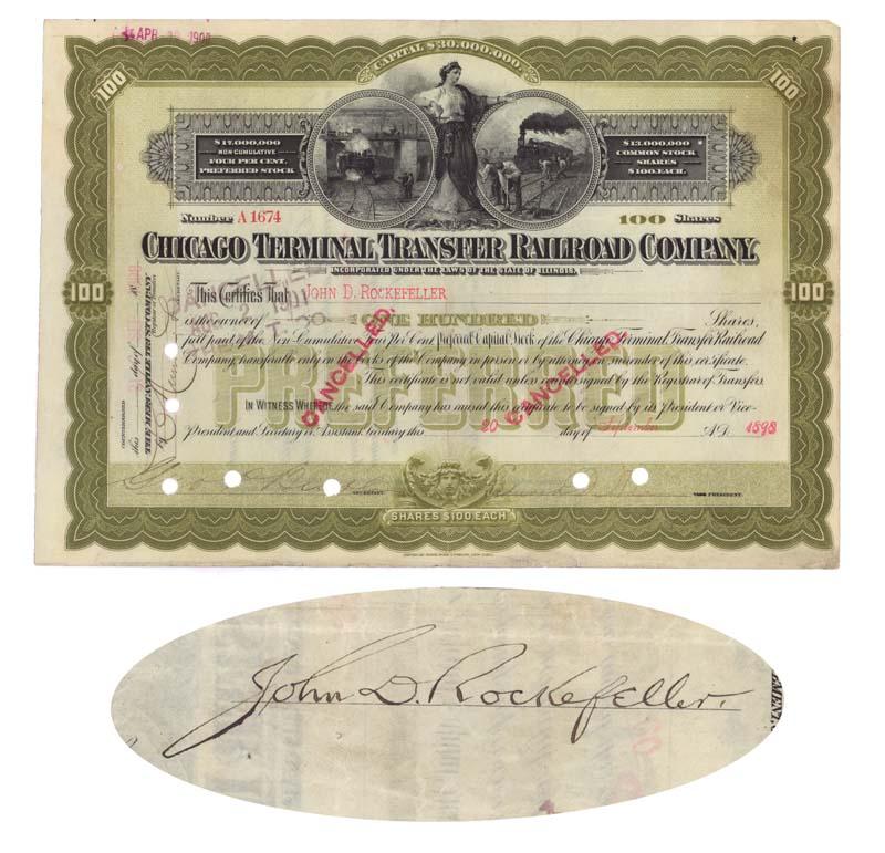 1898. Stock certificate for one hundred shares. Green. Vignette of a Mythic figure between two inner-vignettes of locomotives and railroad workers. Stamp issued to and signed on verso by “John D. Rockefeller.” Punch and stamp cancelled.