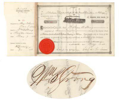1888, Illinois. Stock certificate for one share issued to and signed on verso by WILLIAM BARSTOW STRONG (1837-1914) President of the AT&SF from 1881 to 1889. Black / White. Vignette of a locomotive at top center. Orange company seal. Punch cancelled. After graduating from a Chicago business college, William B. Strong took his first railroad job as a station agent for the Milwaukee and St. Paul Railroad. After a succession of other railroad, Strong succeeded T. Jefferson Coolidge as president of the Atchison, Topeka and Santa Fe Railway. During his tenure, the railway extended to about 7,000 miles, making it the largest railroad in North America at the time. The Atchison, Topeka & Santa Fe Railroad in Chicago was established in order to secure terminals in Chicago.