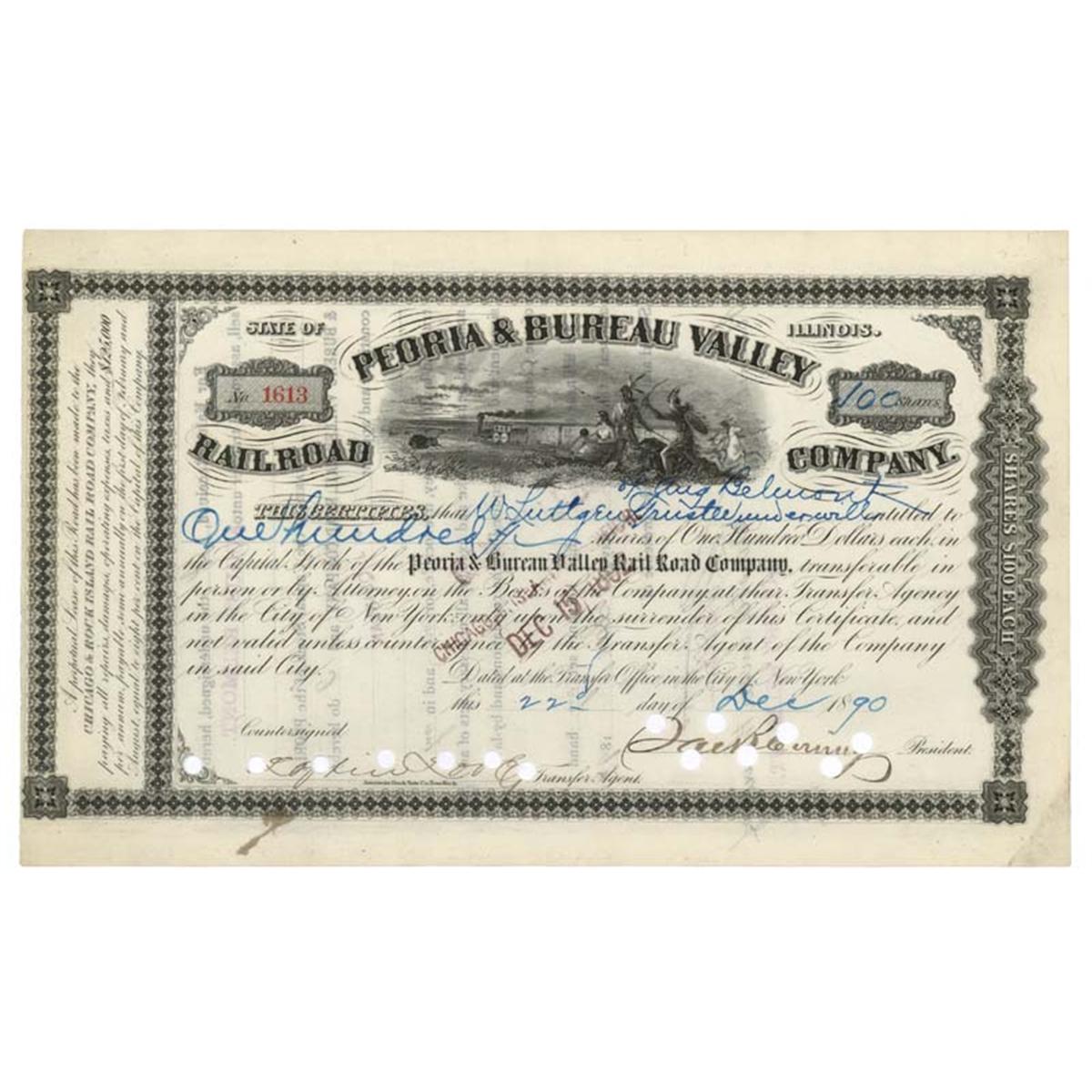 1890, Illinois. Stock certificate for one hundred shares in the Peoria & Bureau Valley Railroad Company issued to “W. Luttgen Trustee under will of Aug. Belmont” Black / White. Vignette of Native Americans watching a train pass at top center. Stamp and punch cancelled. Overall Extremely Fine.