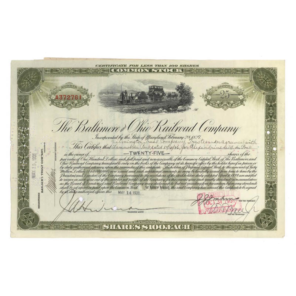 1931, Maryland. Stock certificate for twenty five shares issued to “Wilmington Trust Company, Trustees under agreement with Lammot du Pont, date 12/4/26, for Alexandrine M du Pont.” Green / Black. Vignette of an early steam express coach at top center. Punch, perforation and stamp cancelled. Overall Very Fine.