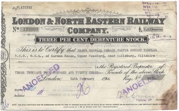 1944, London, England. Three Per Cent Debenture Stock of the London & North Eastern Railway Company. Black. Litho. Issued to Major General Gerald Walter Robert Templer (1898 - 1979). British military commander who rose to the rank of Field Marshal. He was appointed High Commissioner of Malaya and successfully put down the communist insurgency known as the “Malaya Emergency”. The lower right corner is dampstained. Lightly stamp and punch cancelled.