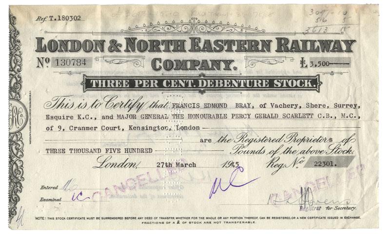 1945, London, England. Three Per Cent Debenture stock certificate. Black. Litho. Issued to Major General Percy Gerald Scarlett (1885 – 1957). Served during both World War I and World War II, Scarlett served as Deputy Adjutant General from 1940-1942. Lightly stamp and punch cancelled. Very Fine.