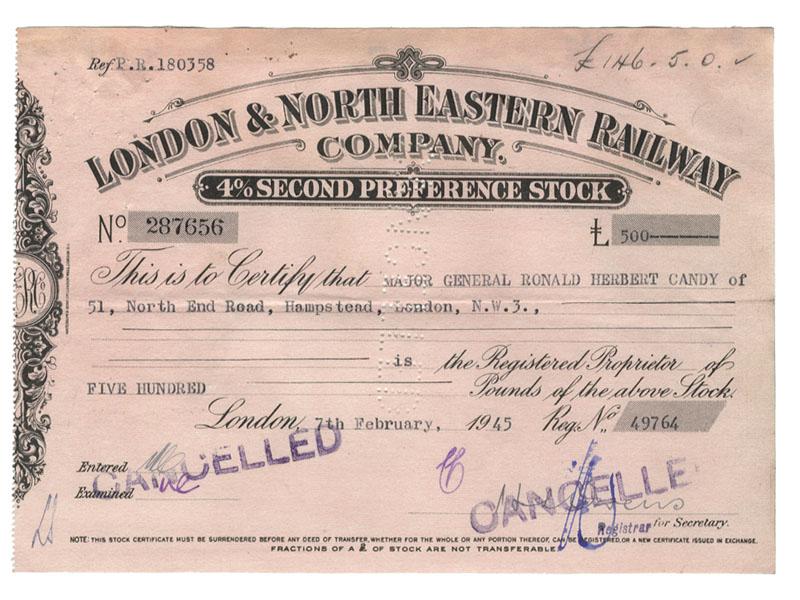 1945, London, England. 4% Second Preference stock certificate. Black on pink paper. Litho. Issued to Major General Ronald Herbert Candy (1888 – 1972). Served as Deputy Director of the Medical Services Eastern Command. Lightly stamp and punch cancelled. Very Fine