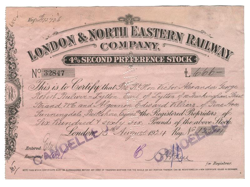 1924, London, England. 4% Second Preference stock certificate. Black on pink paper. Litho. Issued to Victor Alexander George Robert Bulwer-Lytton (1876-1947). 2nd Earl of Lytton. British Politician best known for chairing the Lytton Commission which was tasked by the League of Nations to study the root causes of the 1931 war between China and Japan. The commission’s Lytton Report issued in 1933, was the catalyst for Japan’s withdrawal from the League of Nations. Stamp and punch cancelled. Very Fine.