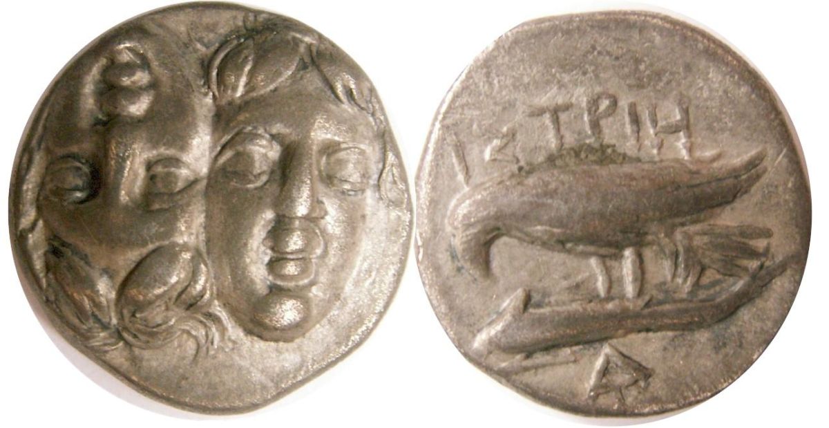 Istros. 4th Century BC. AR Drachm. Facing male heads, the left inverted / Sea-eagle left, grasping dolphin with talons; A below dolphin.