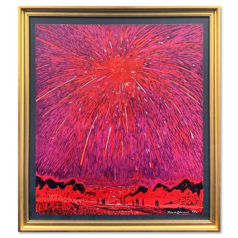 "It Depends on What Direction You Look In" is a limited edition five layer woodcut with screenprinted enamel detailing on Heritage Rag paper by Jules de Balincourt. This piece is numbered 27/50, hand signed by the artist and comes custom framed. Includes Letter of Authenticity. Measures approx. 39" x 35" (frame), 33" x 29" (image).
