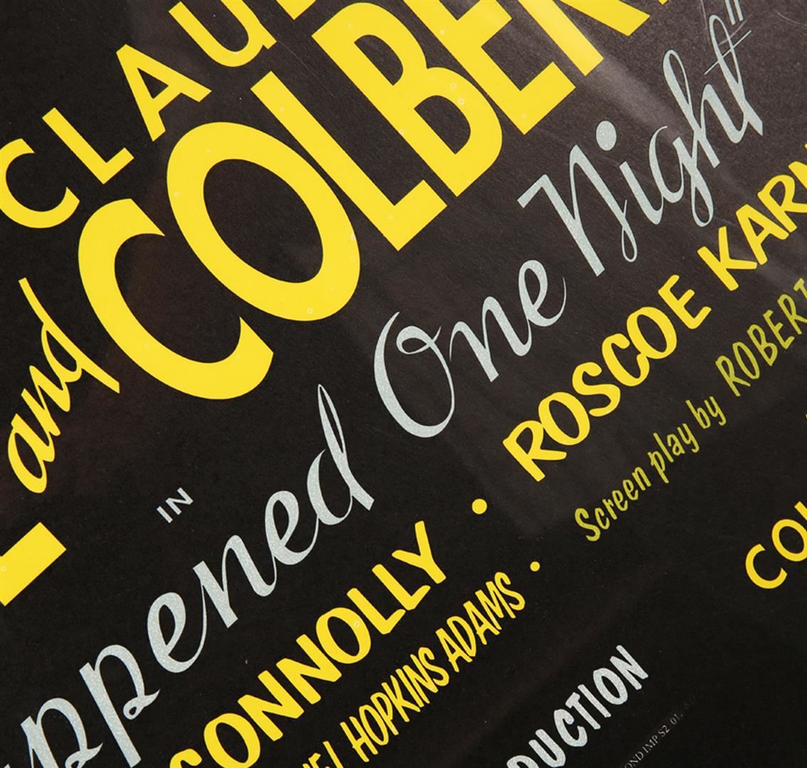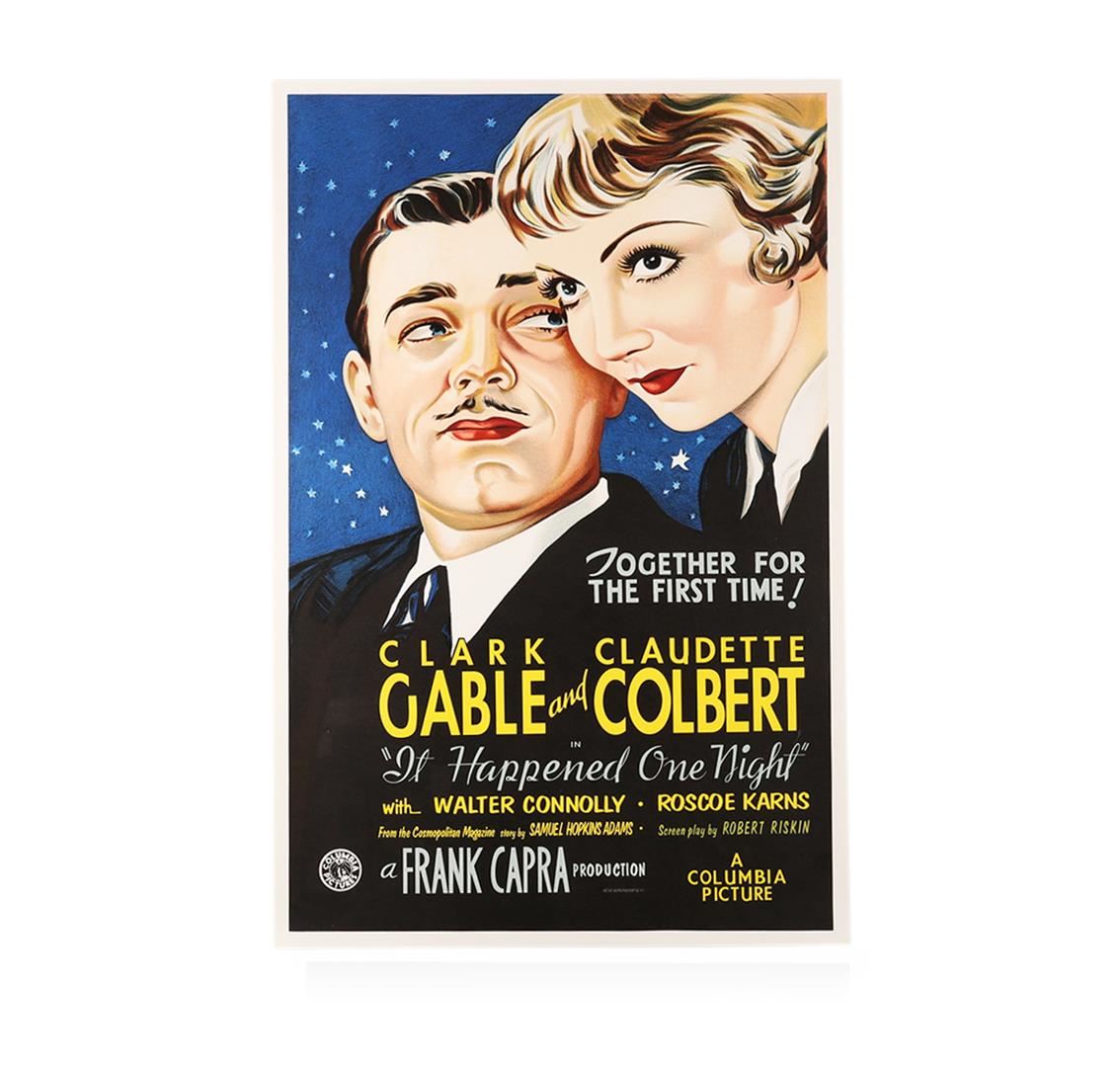 Lithograph hand pulled on Rives 100% cotton paper. The vintage one-sheet was originally created in 1934 for It Happened One Night, starring Clark Gable and Claudette Colbert. The artist is unknown. This one-sheet is one of the S2 Art Group's recreated posters in affiliation with the American Film Institute's "100 American Classic Movie Posters", in 1991. This is a lithograph recreated on a 19th century vintage hand-pulled press. It comes with a certificate of authenticity. Size: 27" x 41"