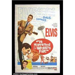 It Happened at the World's Fair (MGM 1963) One sheet. Elvis rocks Seattle! The King is cast in this picture with newcomer Kurt Russell! One of the tougher Presley one sheets to find. Very Fine+ on Linen. Important notice: We expect to be auctioning lots at the rate of 200-250 per hour. Sometimes eBay Premier live bid software cannot keep up with that pace, so we strongly recommend that you place a realistic proxy bid now as insurance to avoid disappointment. Also please note that all Heritage/CAA lots purchased through eBay Premier carry a 20% Buyer's Premium.