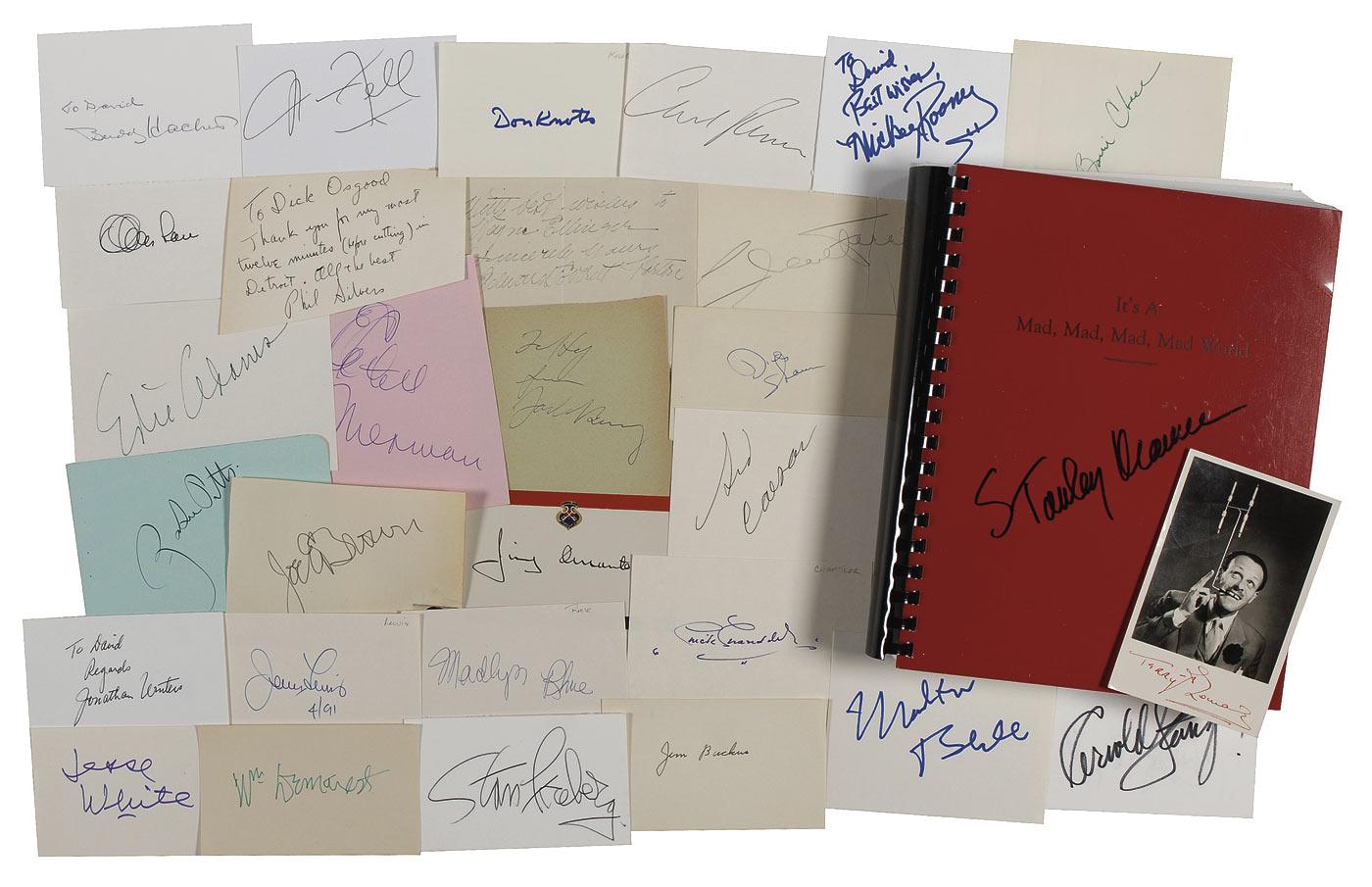 Thirty-two vintage ink or felt tip signatures of It’s a Mad, Mad, Mad, Mad World cast members on individual items including slips, cards, or pages. Signers are: Jack Benny (ins), Joe E. Brown, Jimmy Durante, Buster Keaton, Spencer Tracey (ins.), Mickey Rooney (ins.), Edie Adams, Jim Backus, Milton Berle, Ben Blue, Sid Caesar, Chick Chandler, Barrie Chase, William Demarest, Peter Falk, Stan Freberg, Buddy Hackett (ins.), Edward Everett Horton (ins.) Don Knotts, Charles Lane, Jerry Lewis, Dorothy Provine, Norman Fell, Ethel Merman, ZaSu Pitts, Carl Reiner, Madlyn Rhue, Dick Shawn, Phil Silvers (ins.), Arnold Stang, Jesse White, and Jonathan Winters (ins.). Also included are an 8 x 10 scene signed by Marvin Kaplan and Arnold Stang, a 3.5 x 5.5 cardstock photo of Terry-Thomas, and a script signed on the cover by director Stanley Kramer and on an interior page by Jonathan Winters. Accompanied by eight unsigned stills and an unpublished snapshot of Horton. In overall fine condition. RRAuction COA.