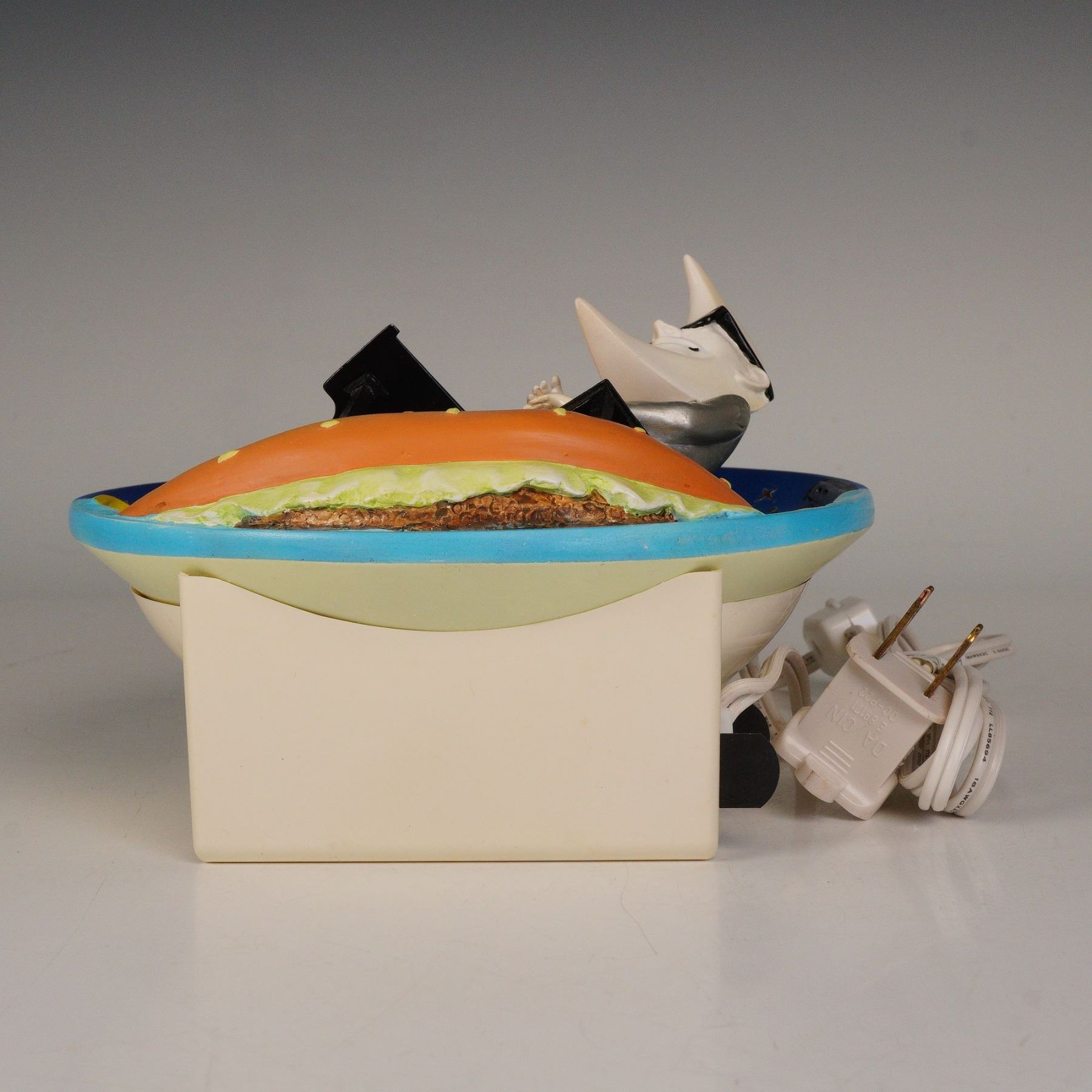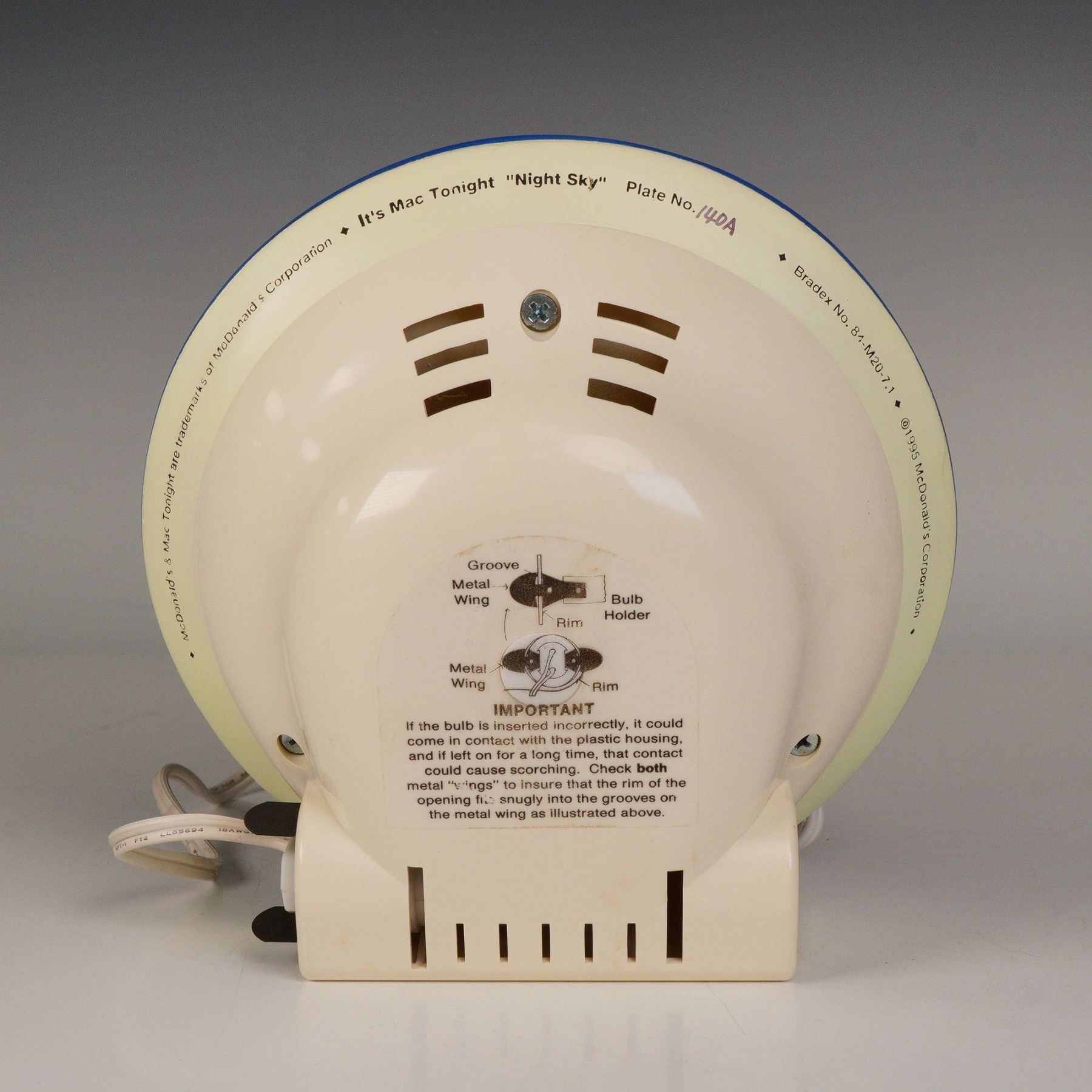 Playful It's Mac Tonight "Night Sky" electric night light featuring the iconic crescent-moon character from McDonald's 1980s advertising campaign. The design depicts Mac Tonight in his silver suit and sunglasses, seated at a piano atop a hamburger bun against a city skyline backdrop with the McDonald's golden arches. The molded relief composition is brightly colored with raised lettering and includes the original plug-in base. Plate No. 140A, marked 1995 McDonald's Corporation. Light tested and in working order.