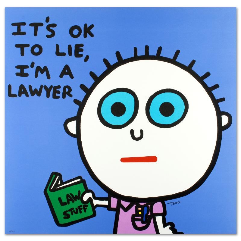 Pop artist Todd Goldman is known all across the globe for his whip-smart and wickedly funny puns and pictures! "It's OK to Lie, I'm a Lawyer" is a limited edition lithograph on paper, numbered and hand signed by Todd. Includes Certificate of Authenticity! Measures approx. 32.5" x 32" (no border).