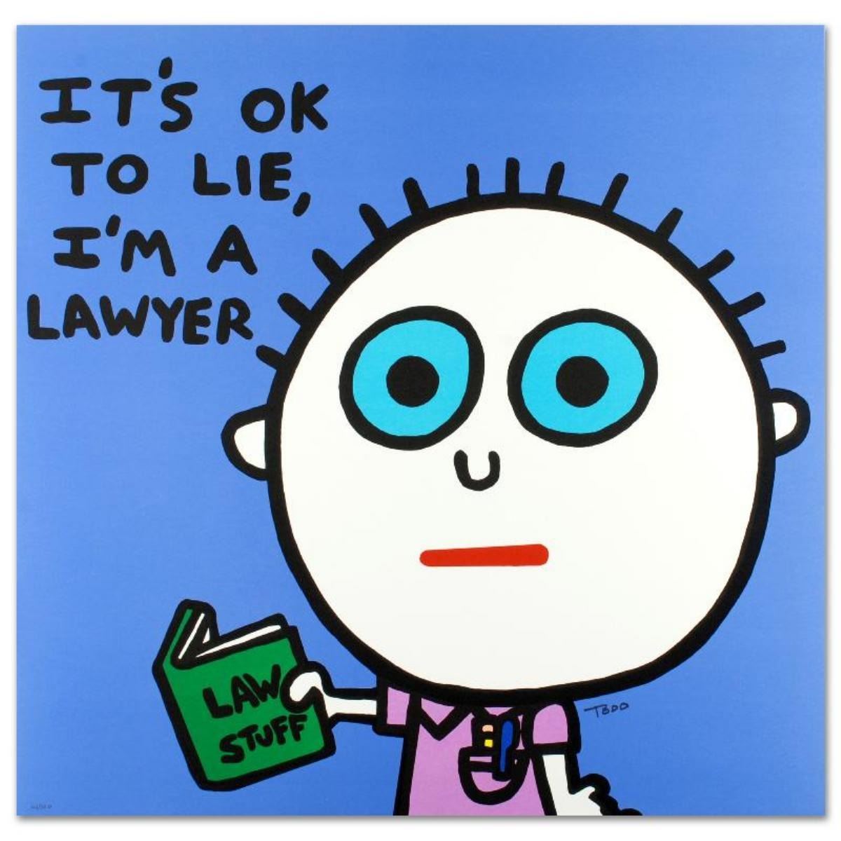 Pop artist Todd Goldman is known all across the globe for his whip-smart and wickedly funny puns and pictures! "It's OK to Lie, I'm a Lawyer" is a limited edition lithograph on paper, numbered and hand signed by Todd. Includes Certificate of Authenticity! Measures approx. 32.5" x 32" (no border).
