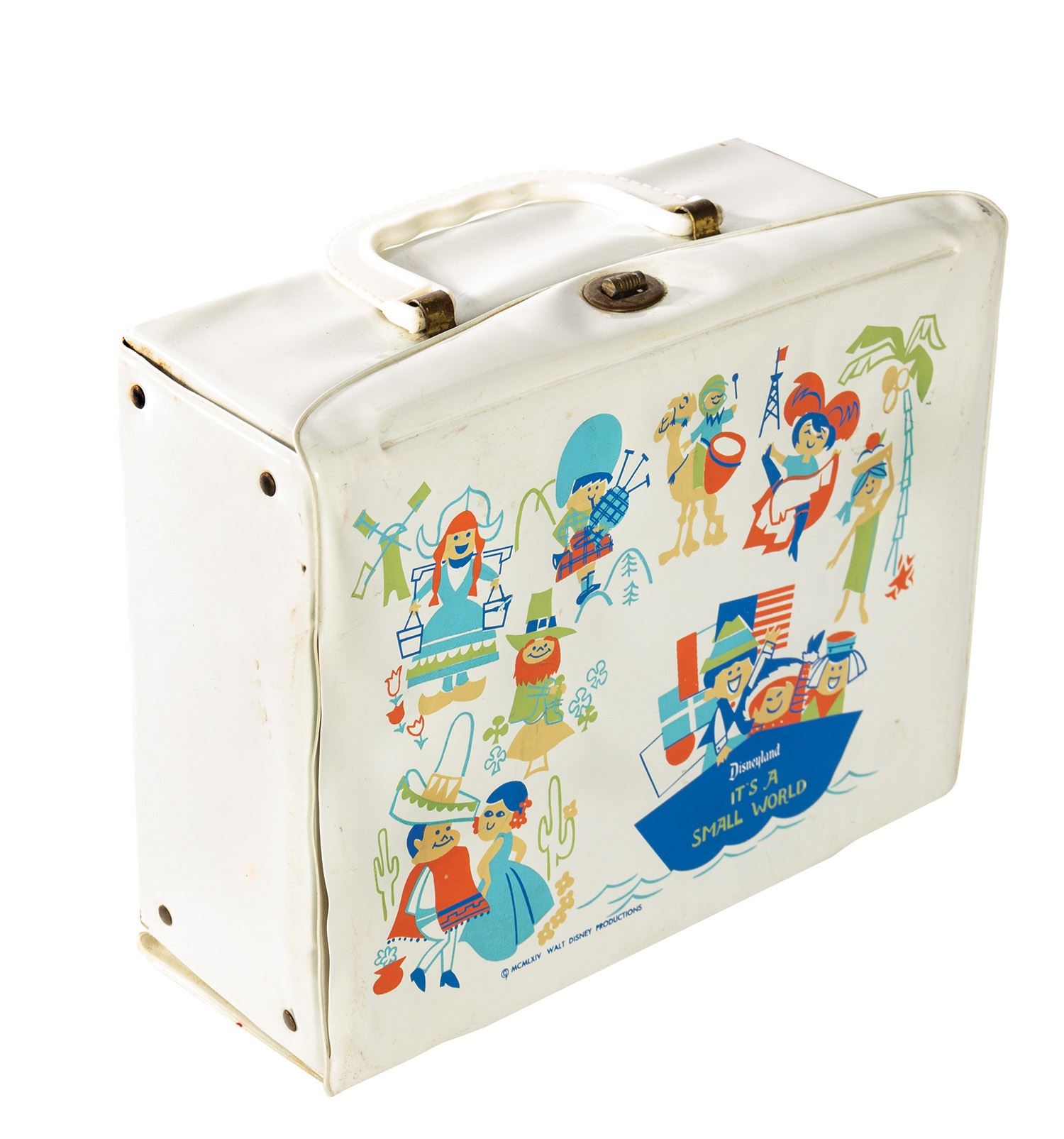 (Disneyland, 1964) A plastic lunchbox inspired by the It's a Small World attraction at Disneyland. The white plastic lunchbox depicts imagery from various countries around the world that are featured in the ride. Measuring 7"x9" and 3.5" thick, the lunchbox is in fair to good condition with spots of discoloration to the surface and split seams on some edges.