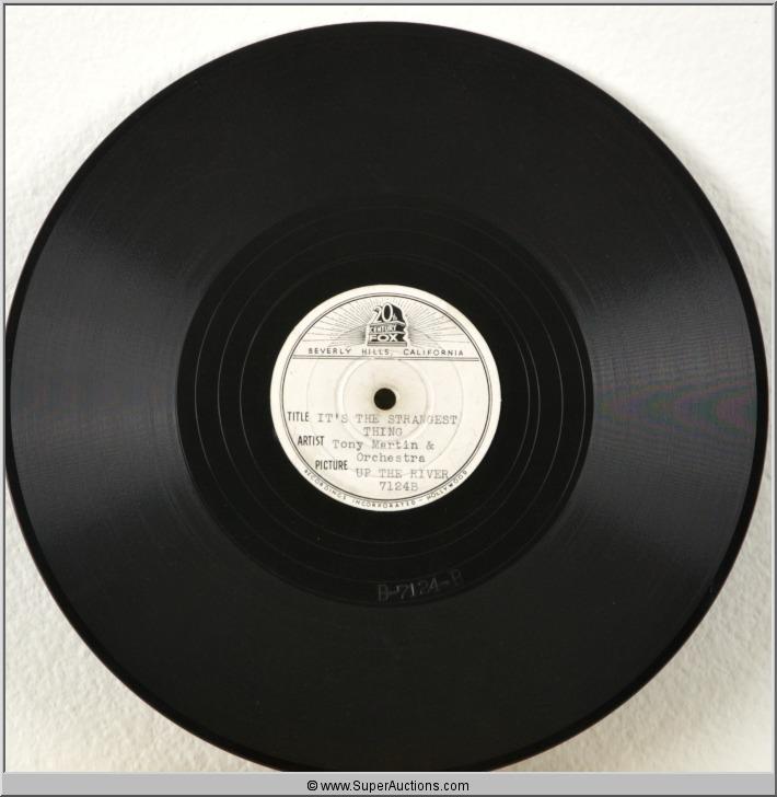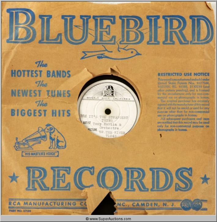 Allied Phonograph & Record Mfg. Co. Radio Disk / Title: "It's The Strangest Thing" / Artist: Tony Martin & Orchestra / Picture: Up The River 7124B / B-7124-B / 20th Century Fox / Beverly Hills, California / Bluebird Records paper cover is torn