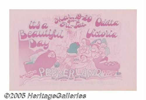 <B>It's a Beautiful Day Handbill (1971).</B></I> The handbill version of the Pepperland poster in this auction. Featuring Snow White and the seven dwarfs, the handbill is actually tougher to find than the poster. Condition is near mint.