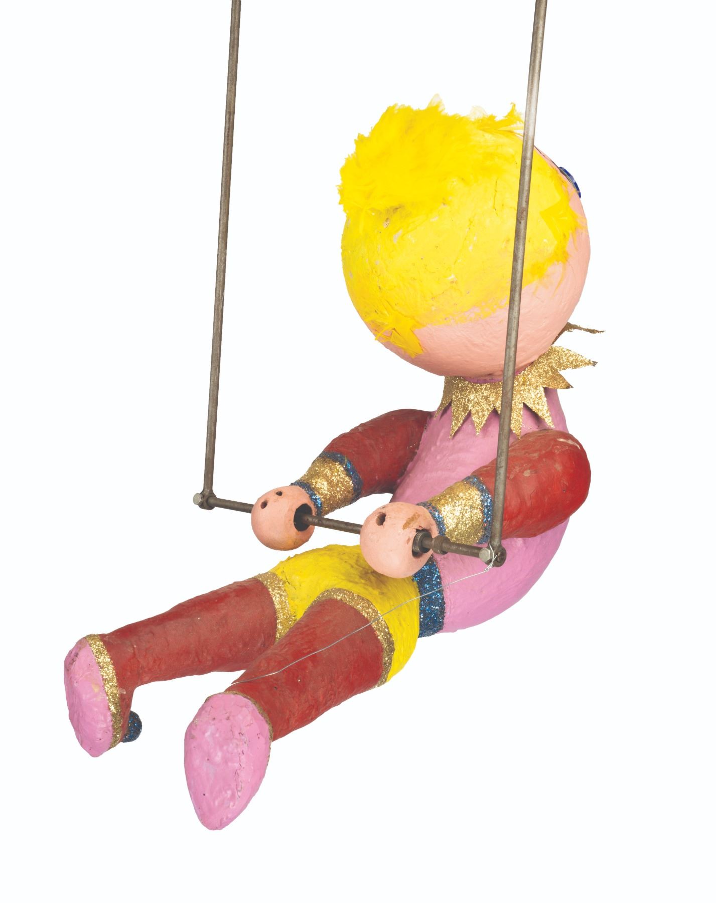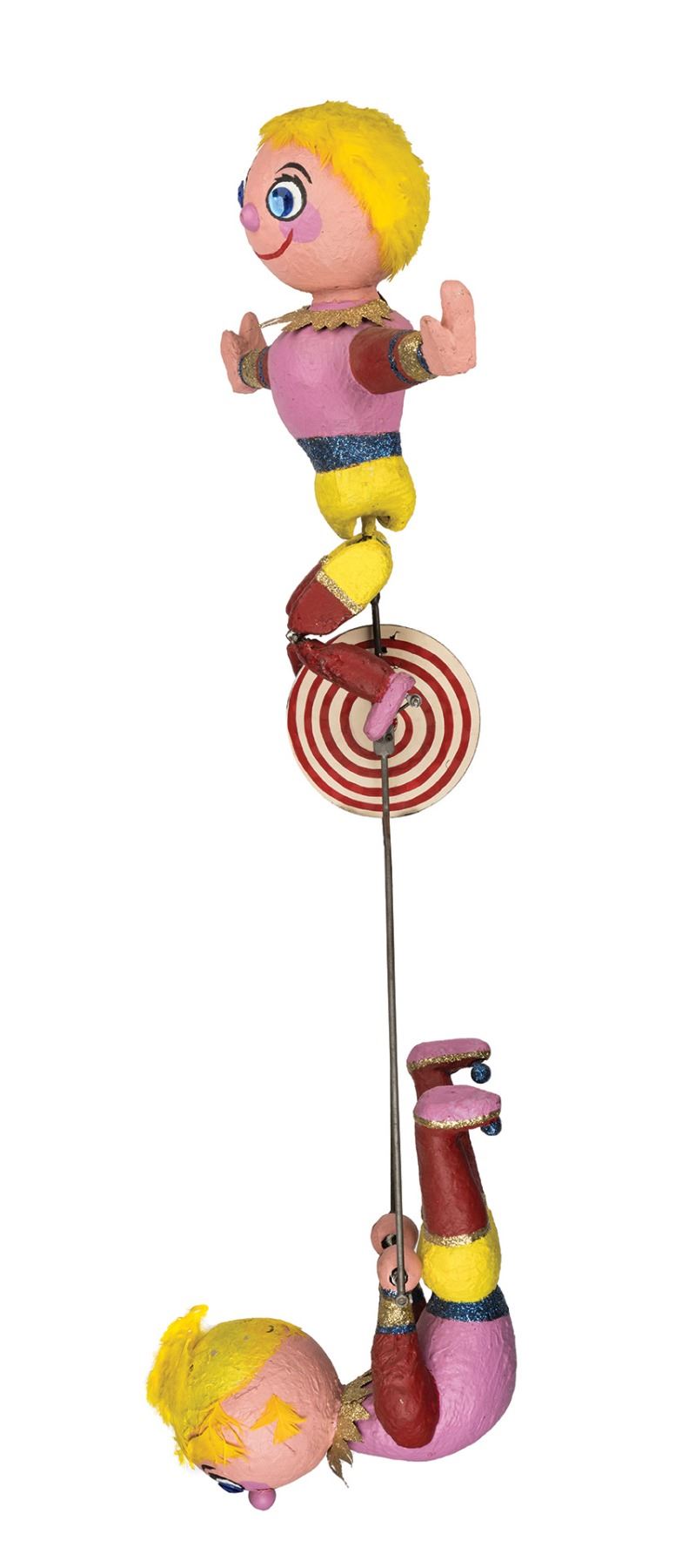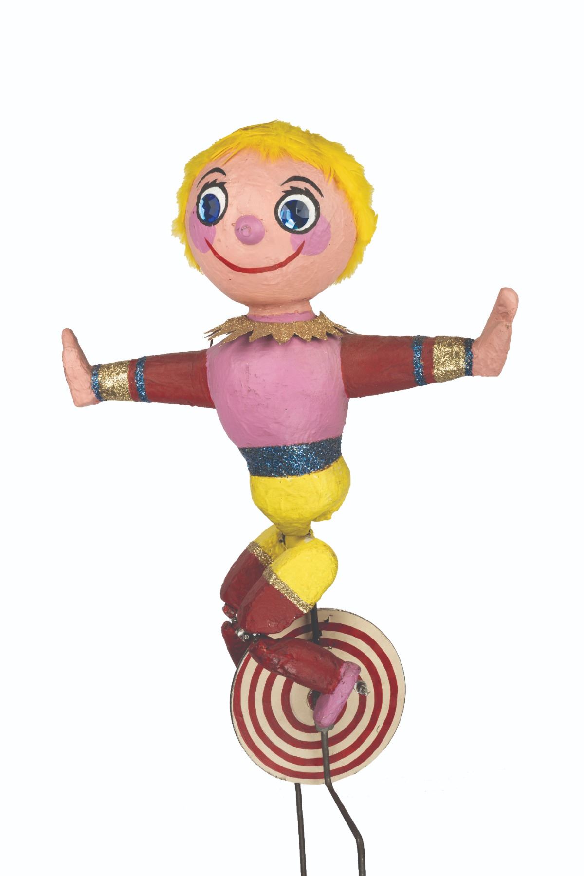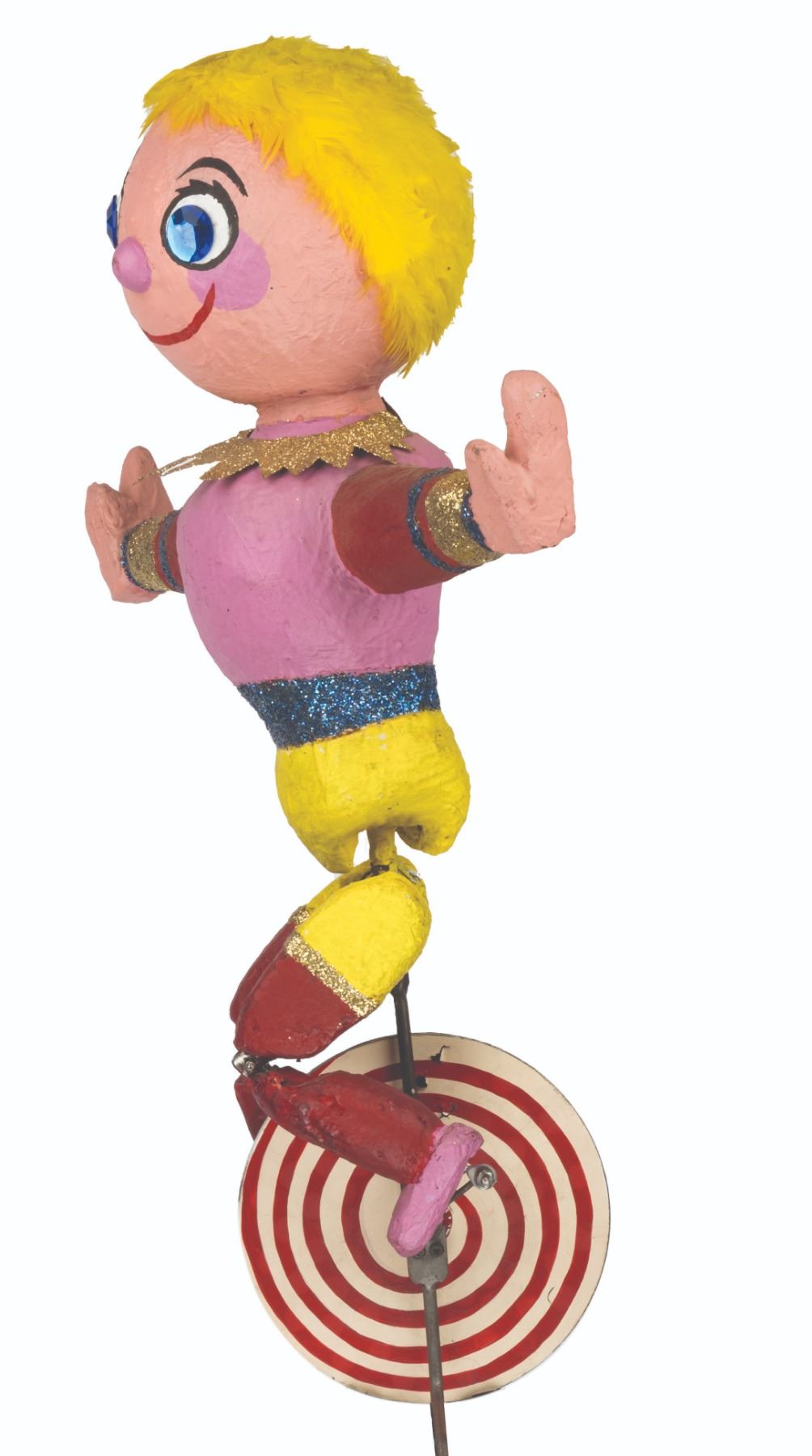 (Disneyland, 1966-80s) A pair of Aerial Artist Doll Figures from it's a small world in Fantasyland at Disneyland. The pair of doll figures were designed by Legendary Walt Disney Imagineers Marc Davis and Mary Blair, for installment at Disneyland. Each charming composition figure is hand painted, and accented with both sparkling glitter and rhinestone eyes. Further, the mechanized figures were perfectly weighted and once performed a circus tightrope balancing act over the Europe segment of the attraction and were removed during a rehabilitation. Measuring 23.5" and 17.5" tall and 7.25" to 17.25" wide, the figures are attached to their unicycle and acrobatic implements, and are in very good condition with scuffs, scratches, and expected wear from Park-use, handling, and age.