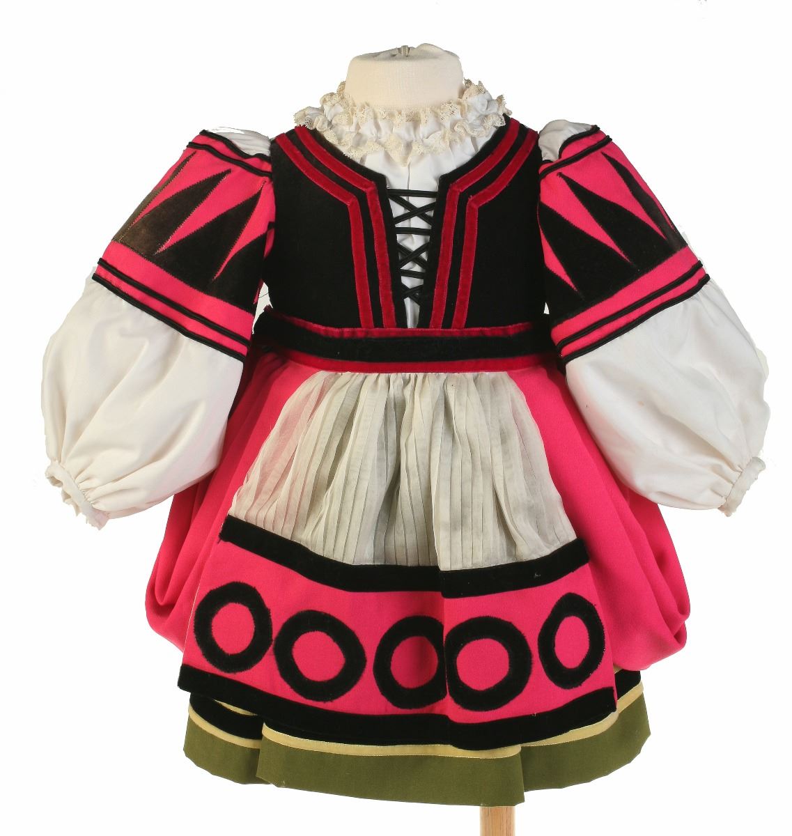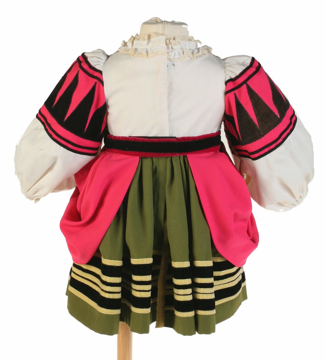 (Disneyland, 1970s) Extremely rare costume from a "Small World" doll featured on a float in the Main Street Electrical Parade in the 1970s. This Scandinavian-themed costume features a green rayon dress with black velvet striping. A pleated apron attaches with velcro closure. Puffed cotton sleeves, corset ties, and black velvet make up the bodice. Measures approximately 17.5"x15.5". In very good condition with some wear from its use at the park. Comes with a certificate of authenticity from Disney Auctions.