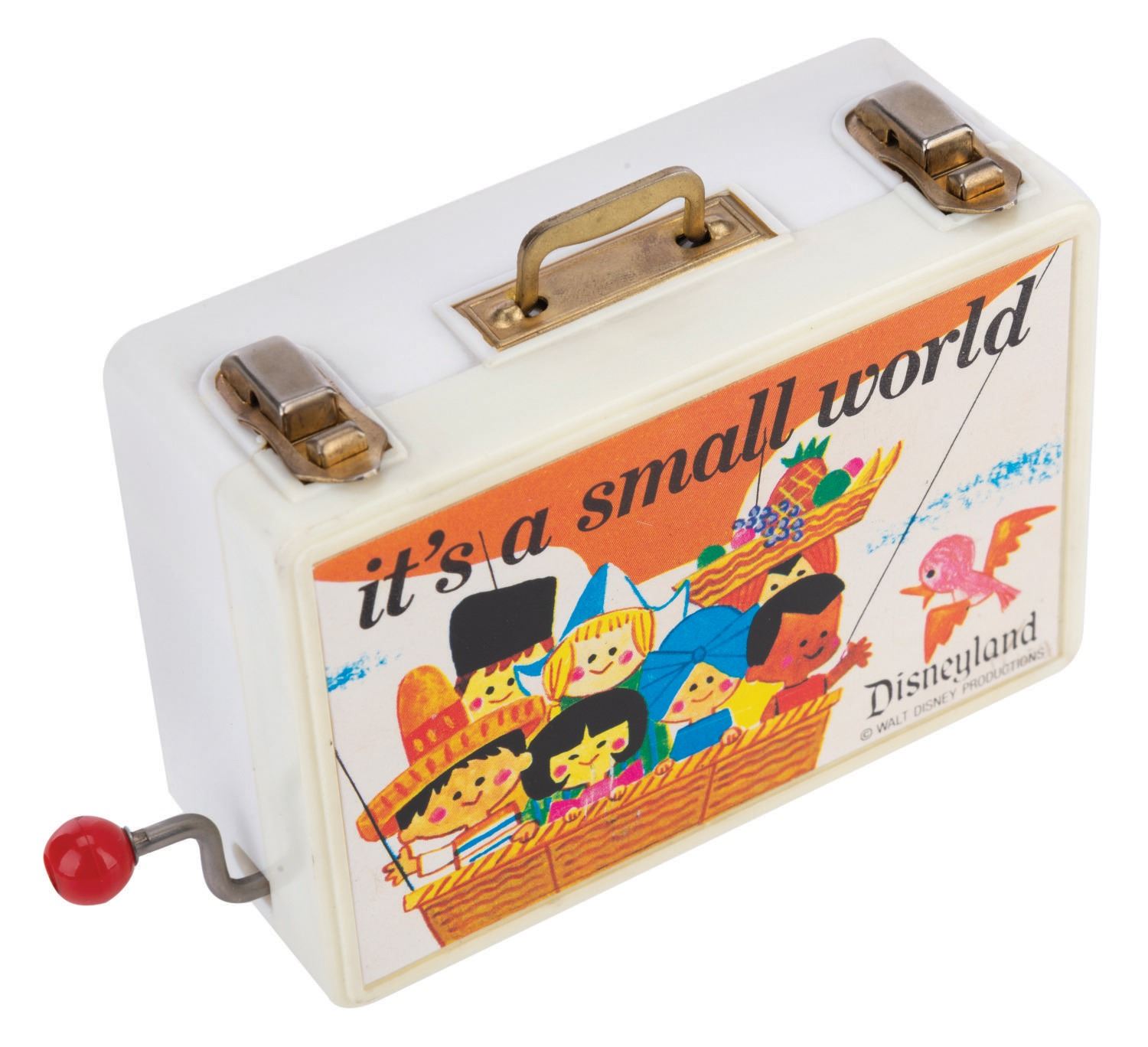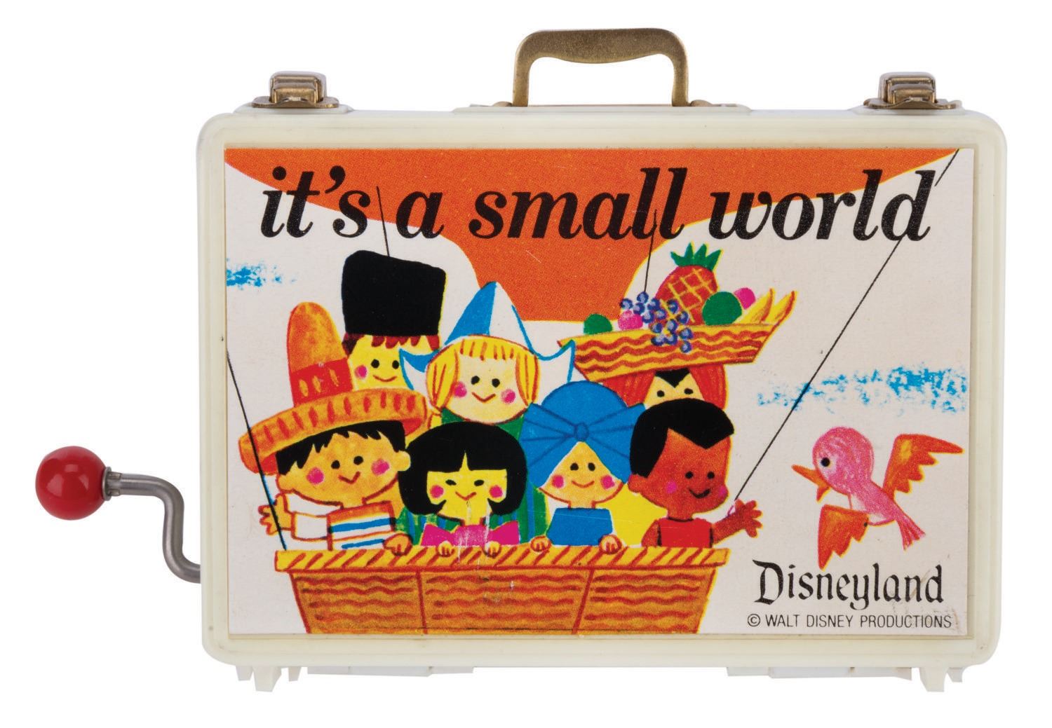 (Disneyland, 1960's) An It's a Small World Music Box, shaped like a suitcase. The piece opens to reveal a mirror inside, and plays "It's a Small World" when the crank is turned. Measuring 4.5"x2.5"x1.5", the music box is in very good to fine working condition.