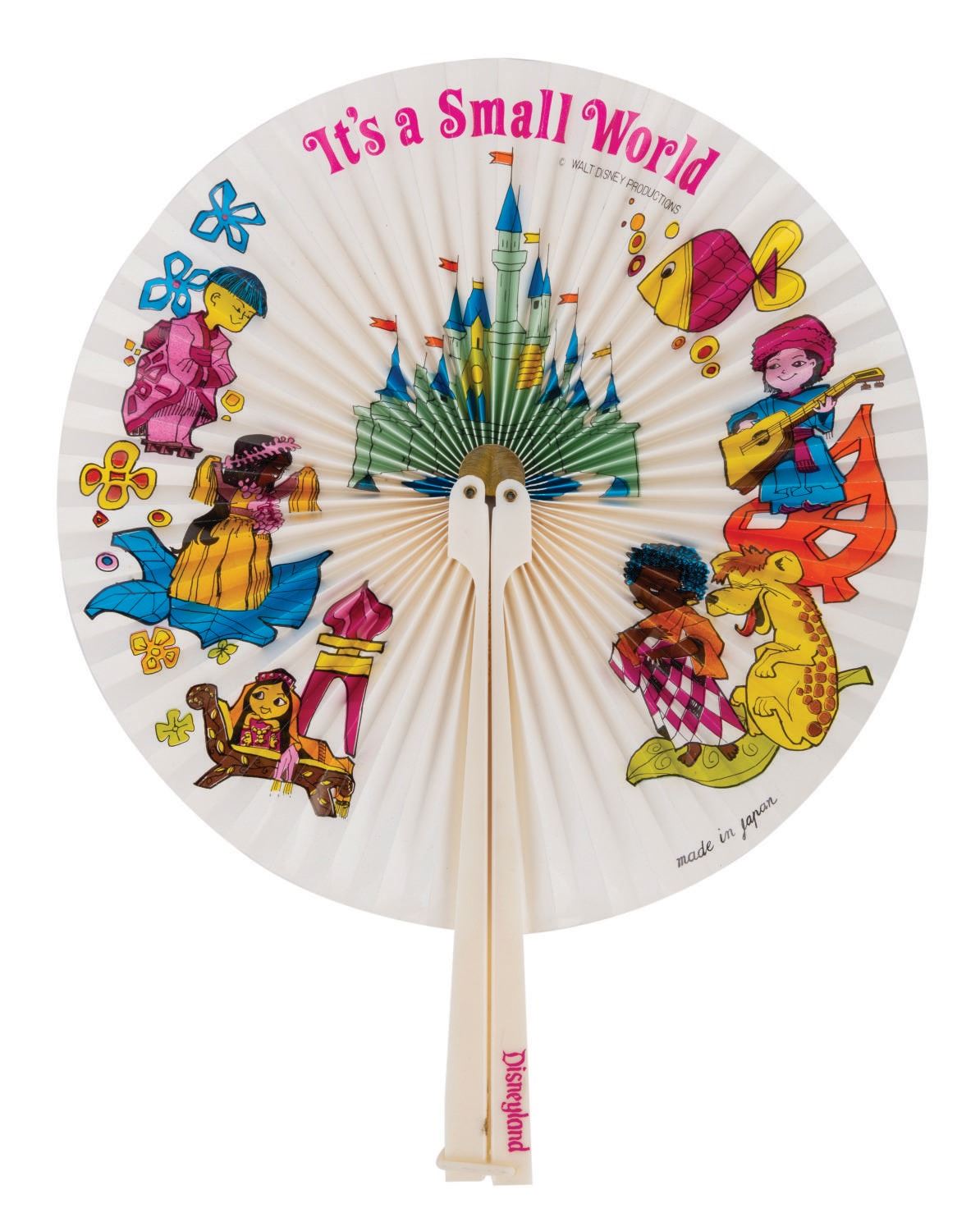 (Disneyland, 1960's) A Japanese paper folding fan with plastic handle, decorated with characters from It's a Small World. Measuring 8.25" in diameter with 2.5" handle, the fan is in very good condition.