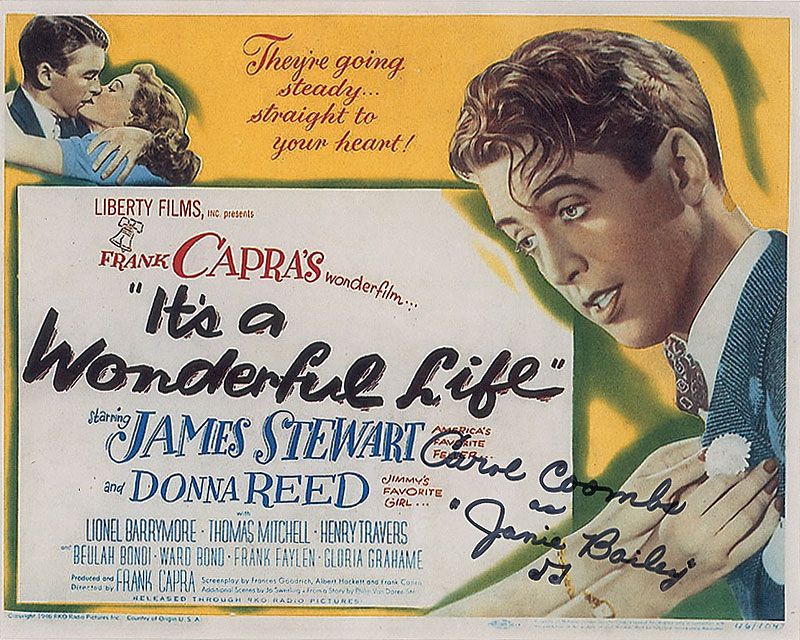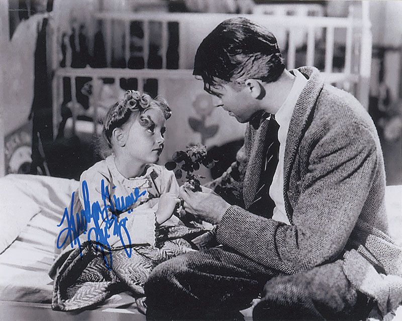 Two different satin-finish 10 x 8 photos, one color photo of a poster for the film, signed in black felt tip, “Carol Coombs, Janie Bailey,” adding a small musical note; the other signed in blue felt tip, “Karolyn Grimes, ‘Zu Zu.’” In fine condition.
