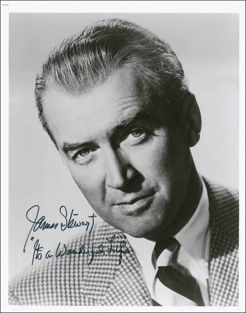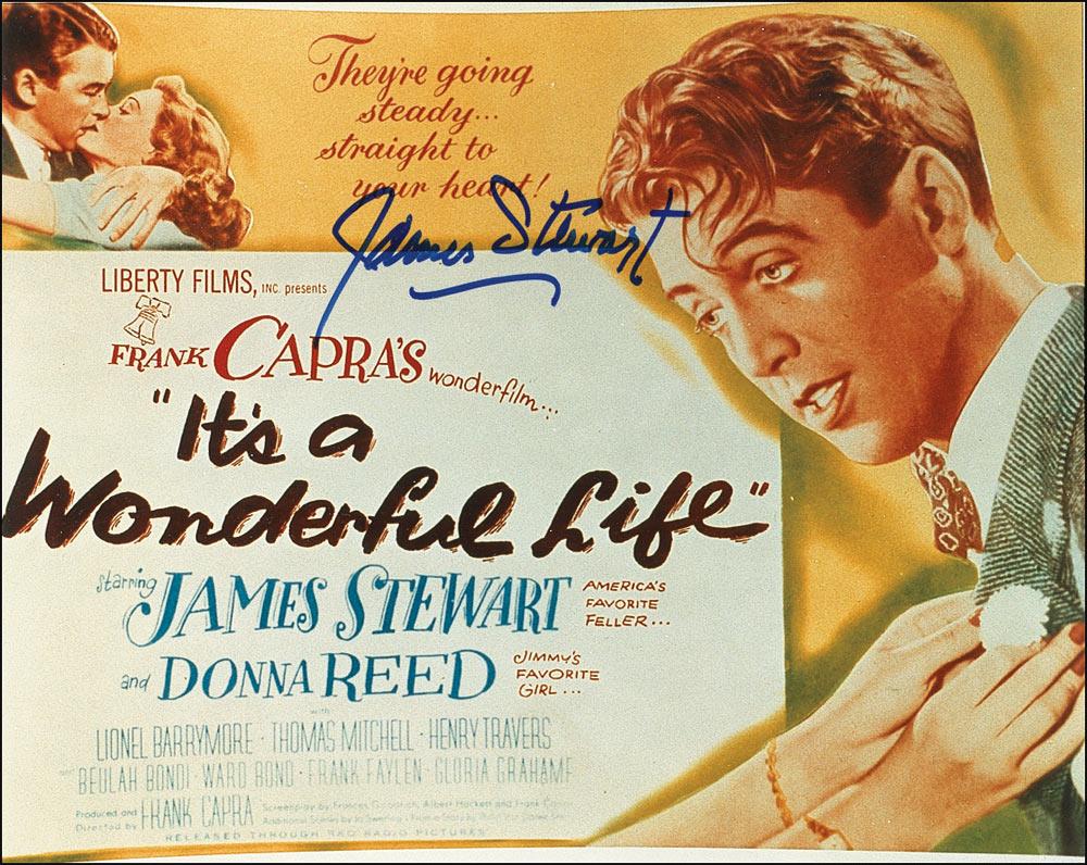 Two items: color glossy 10 x 8 photo of an It’s a Wonderful Life lobby card, signed in blue felt tip, “James Stewart”; and an 8 x 10 glossy portrait signed in black felt tip, “James Stewart, ’It’s a Wonderful Life’” In fine condition.