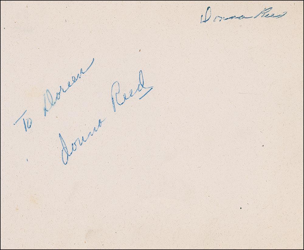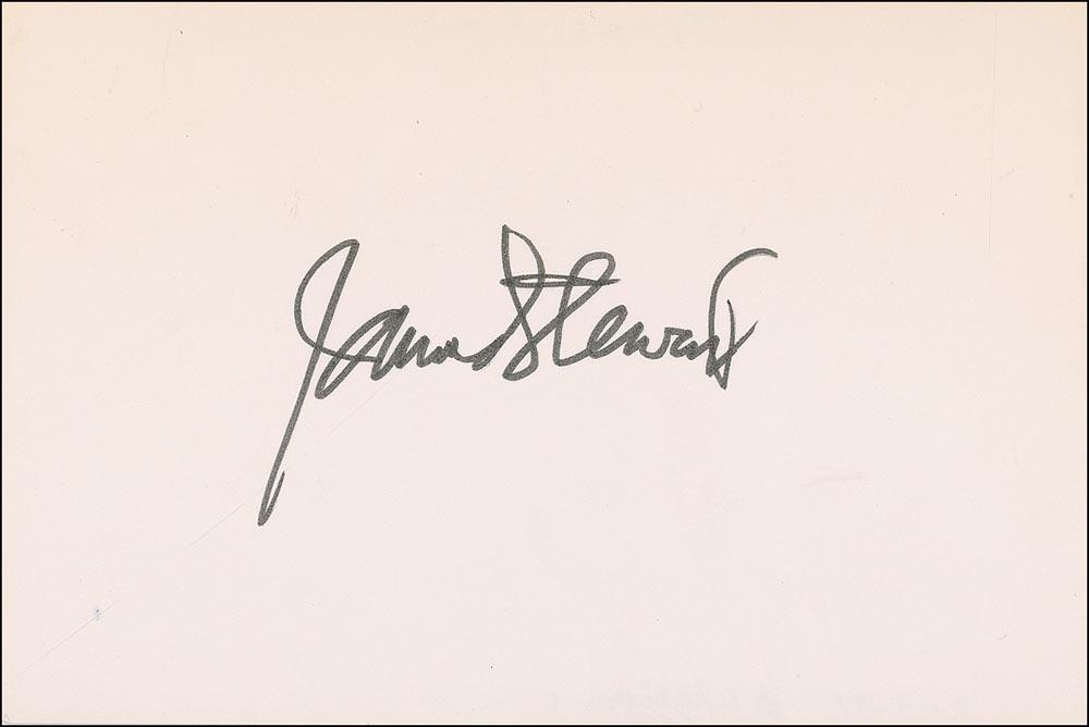 Felt tip in-person signature, “James Stewart,” on an off-white 6 x 4 card; and a vintage ballpoint in-person signature and inscription, “To Doreen, Donna Reed,” on an off-white 5.25 x 4.5 album page. In fine condition, with a James Spence authentication label affixed to reverse of Reed’s page, as well as a few mild creases.