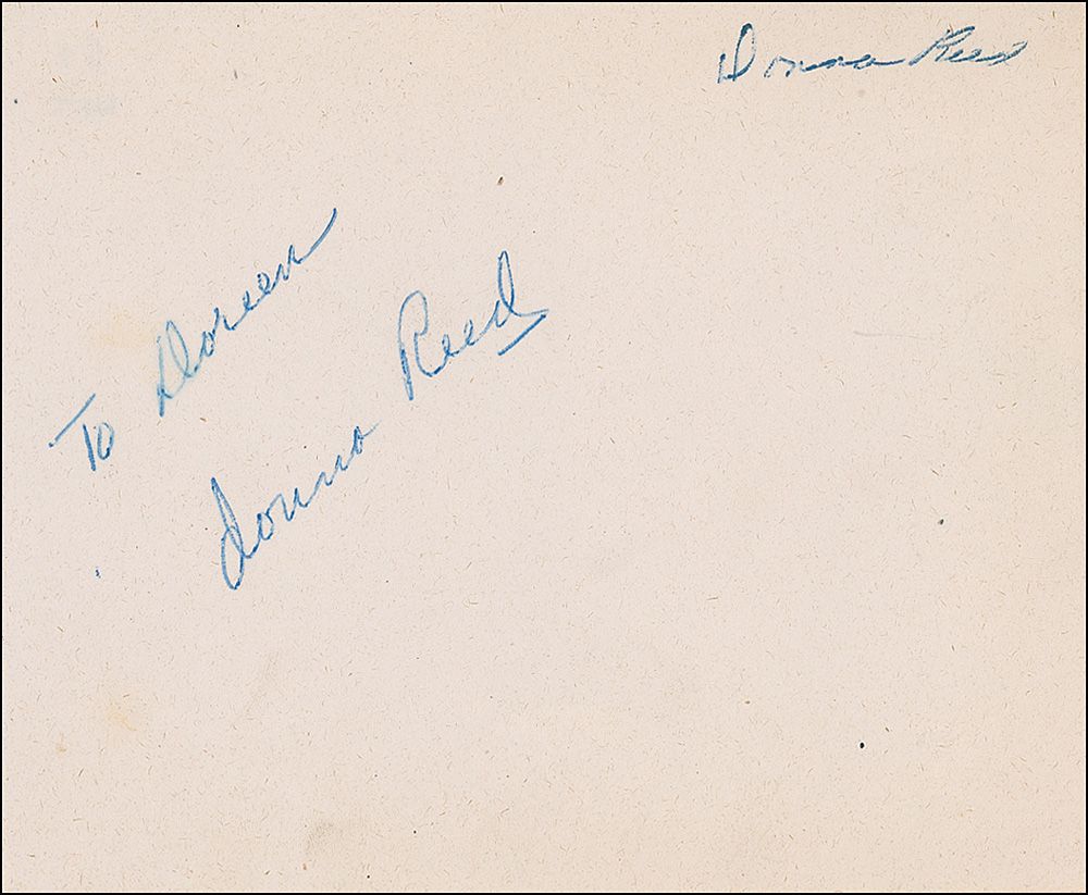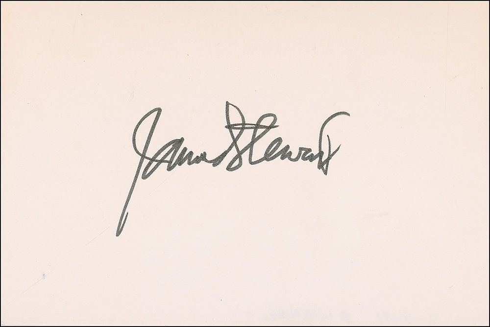 Felt tip in-person signature, “James Stewart,” on an off-white 6 x 4 card; and a vintage ballpoint in-person signature and inscription, “To Doreen, Donna Reed,” on an off-white 5.25 x 4.5 album page. In fine condition, with a James Spence authentication label affixed to reverse of Reed’s page, as well as a few mild creases.