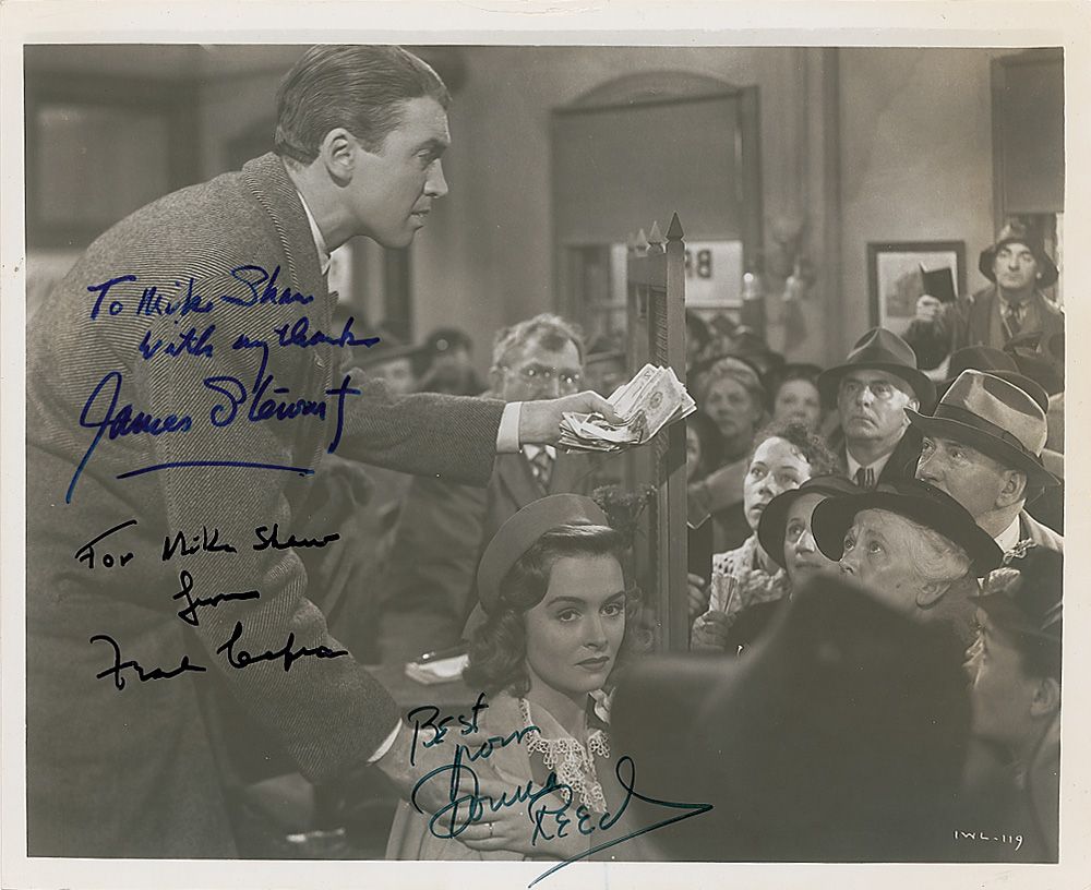 Dramatic glossy 10 x 8 photo from the film, signed and inscribed in blue and black felt tip “To Mike Shaw, with my thanks, James Stewart,” “For Mike Shaw, from, Frank Capra,” and “Best, from Donna Reed.” In very good condition, with scattered light creases, scattered impressions to the right side, a surface ding and crease to the upper border, and some spotting and horizontal streaking to the finish.