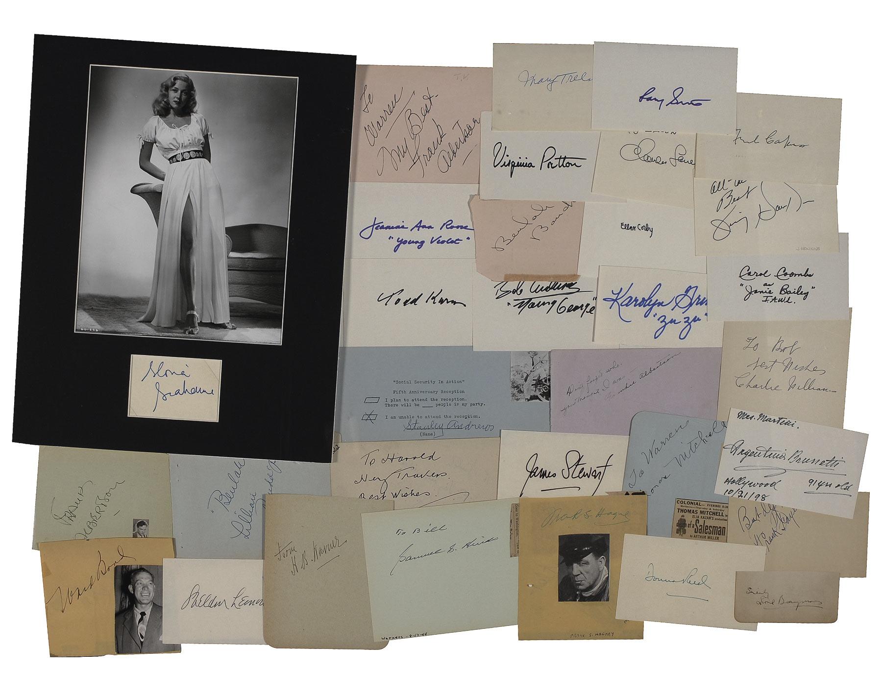 Thirty vintage ink signatures, on individual album pages or cards, of Frank Capra, James Stewart, Donna Reed, Henry Travers, Lionel Barrymore, Thomas Mitchell, Frank Faylen, Ward Bond, H. B. Warner, Charlie Williams, Frank Albertson, Carol Coombs, Lillian Randolph, Bob Anderson, Beulah Bondi, Ellen Corby, Virginia Patton, Karolyn Grimes, Charles Lane, Mary Treen, Larry Simms, Jeanine Ann Roose, Todd Karns, Stanley Andrews, Sheldon Leonard, Jimmy Hawkins, Samuel S. Hinds, Argentina Brunetti, Frank Hagney, and Gloria Grahame (matted with photo). In overall very good to fine condition. A great chance to acquire an immediate mini-collection of all of the key players of this holiday classic!