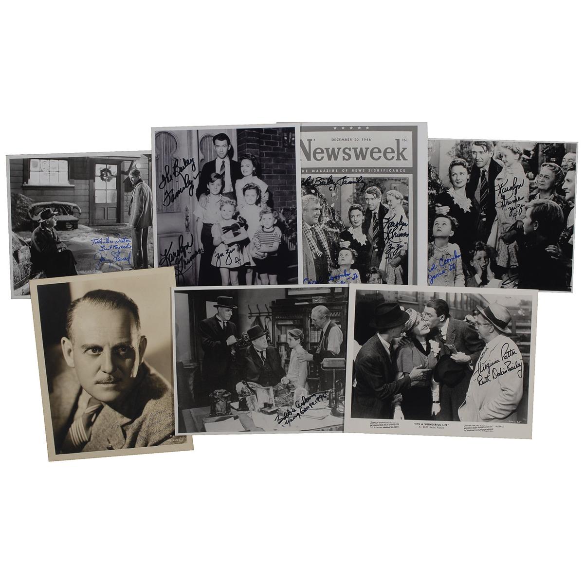 Seven photos, 8 x 10 or 10 x 8, signed in blue or black felt tip by at least one of the cast members pictured. Signers are: Jimmy Stewart (ins), Karolyn Grimes, Virginia Patton, Bobbie Anderson, and Moroni Olsen (vintage ins). Accompanying are two multi-signed photos respectively signed by Carol Coombs, Karolyn Grimes, Jimmy Hawkins; and Grimes and Coombs. In overall fine condition.