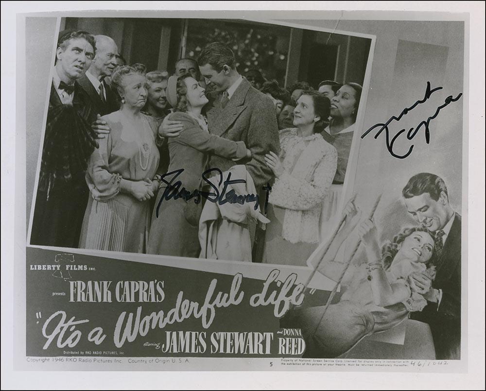 Glossy 10 x 8 photo of a film poster for ‘It’s a Wonderful Life,’ signed in black felt tip by James Stewart and Frank Capra. In fine condition, with a light vertical scratch which passes through a couple letters of Capra’s signature.