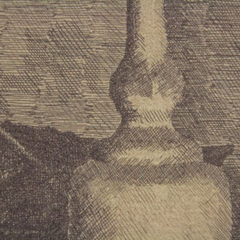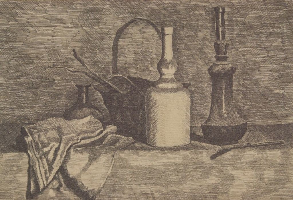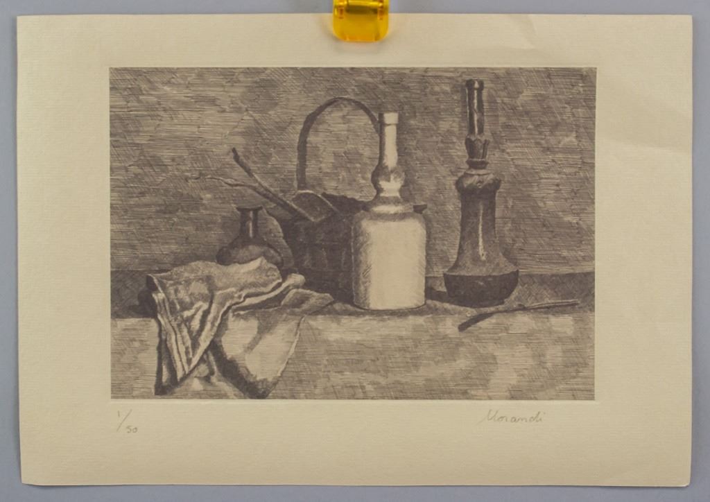 Linocut etching on paper. Featuring a still life of vases, basket atop table. Signed Morandi and inscribed 1/50 on the lower right and lower left corner, respectively. 21 x 30 cm (8.3 x 11.7 inch)