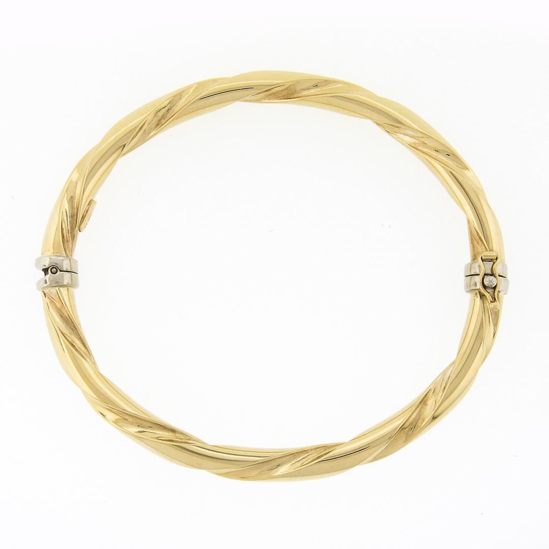 A solid 14k yellow gold open bangle bracelet. It weighs a total of 9.19 grams, measures 5.6mm wide, and measures 7 inches in length.