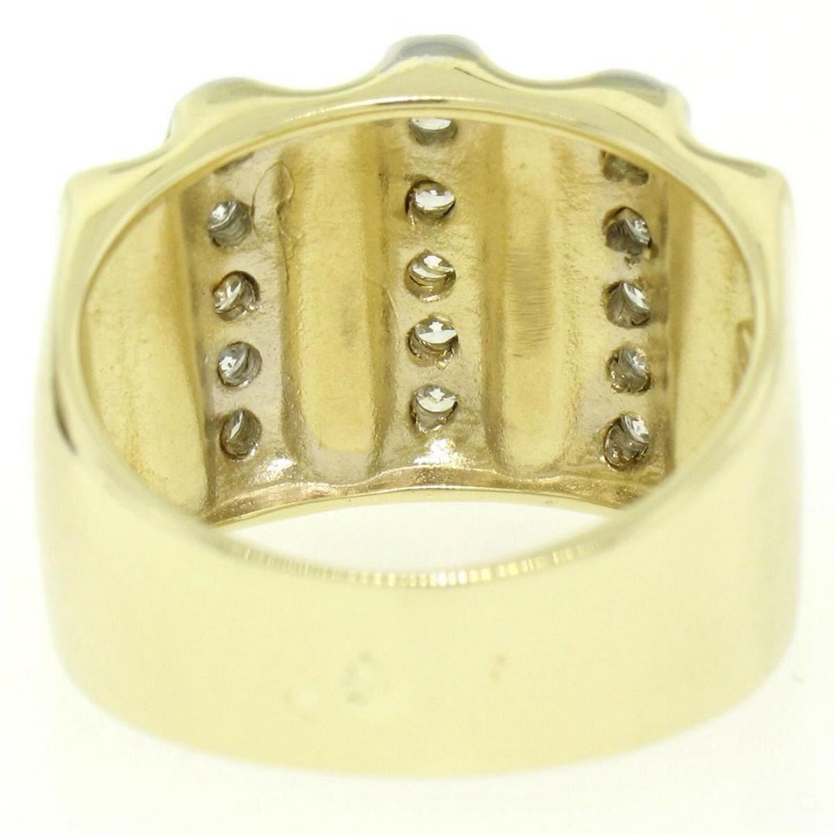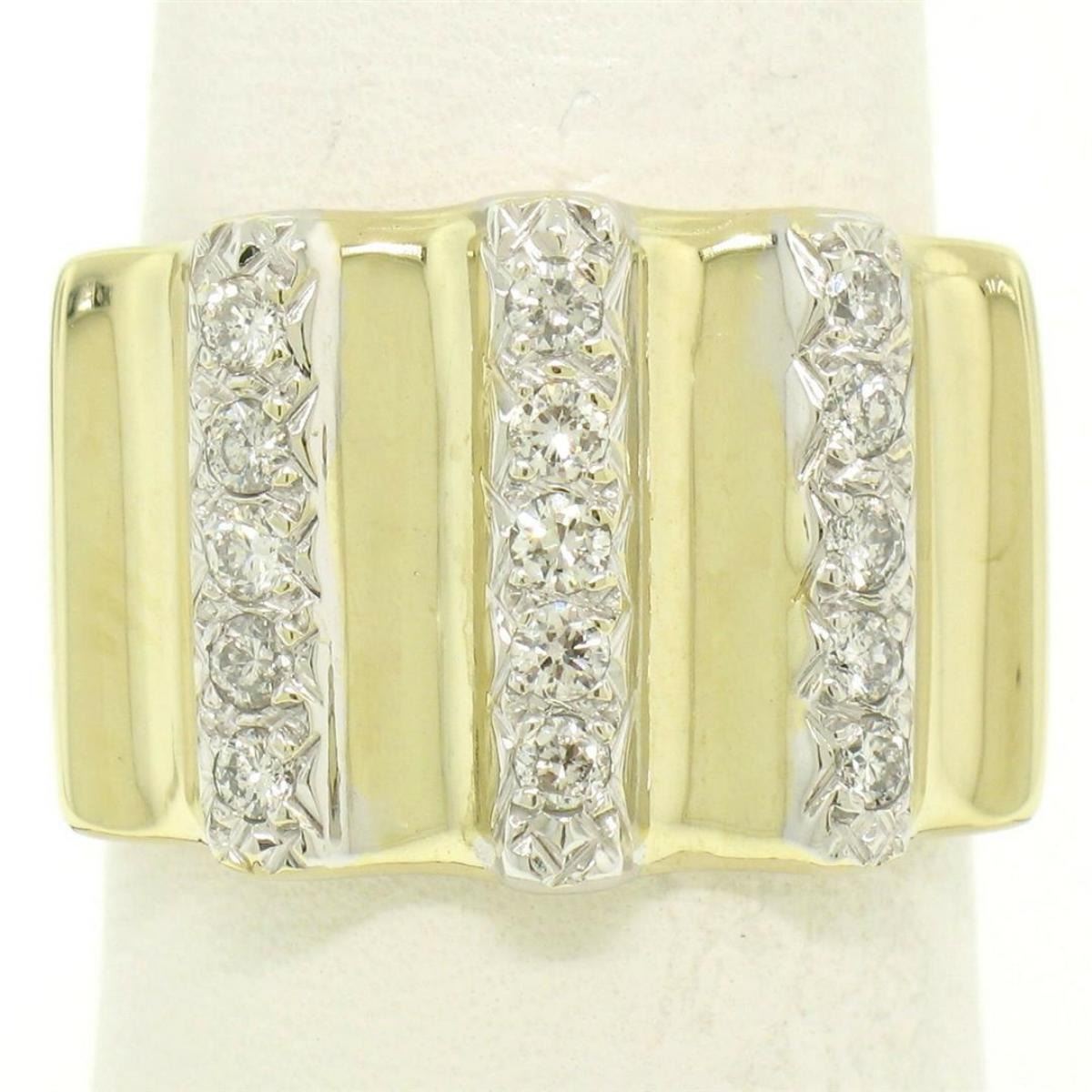 One Solid 14k Solid Yellow Gold Wide band ring with vertical grooved desgin. Measures 14.15mm wide and 3.6mm rise off the finger. 15 round diamonds total approx. 0.35ctw with VS1 clarity and G/H color. Weight is 9.20 grams.