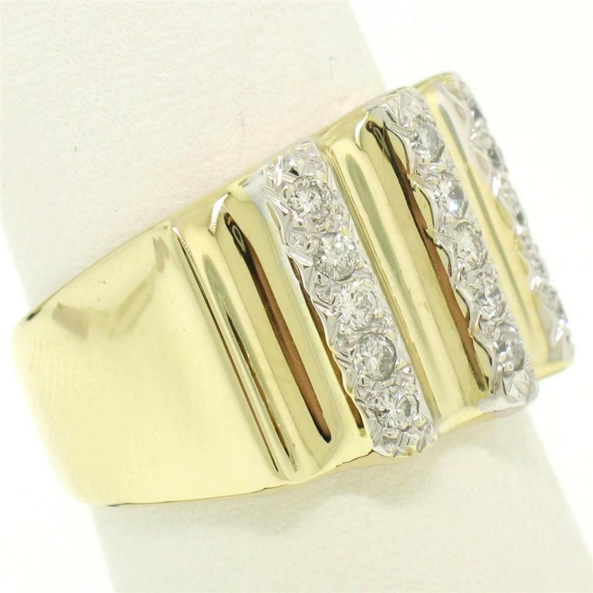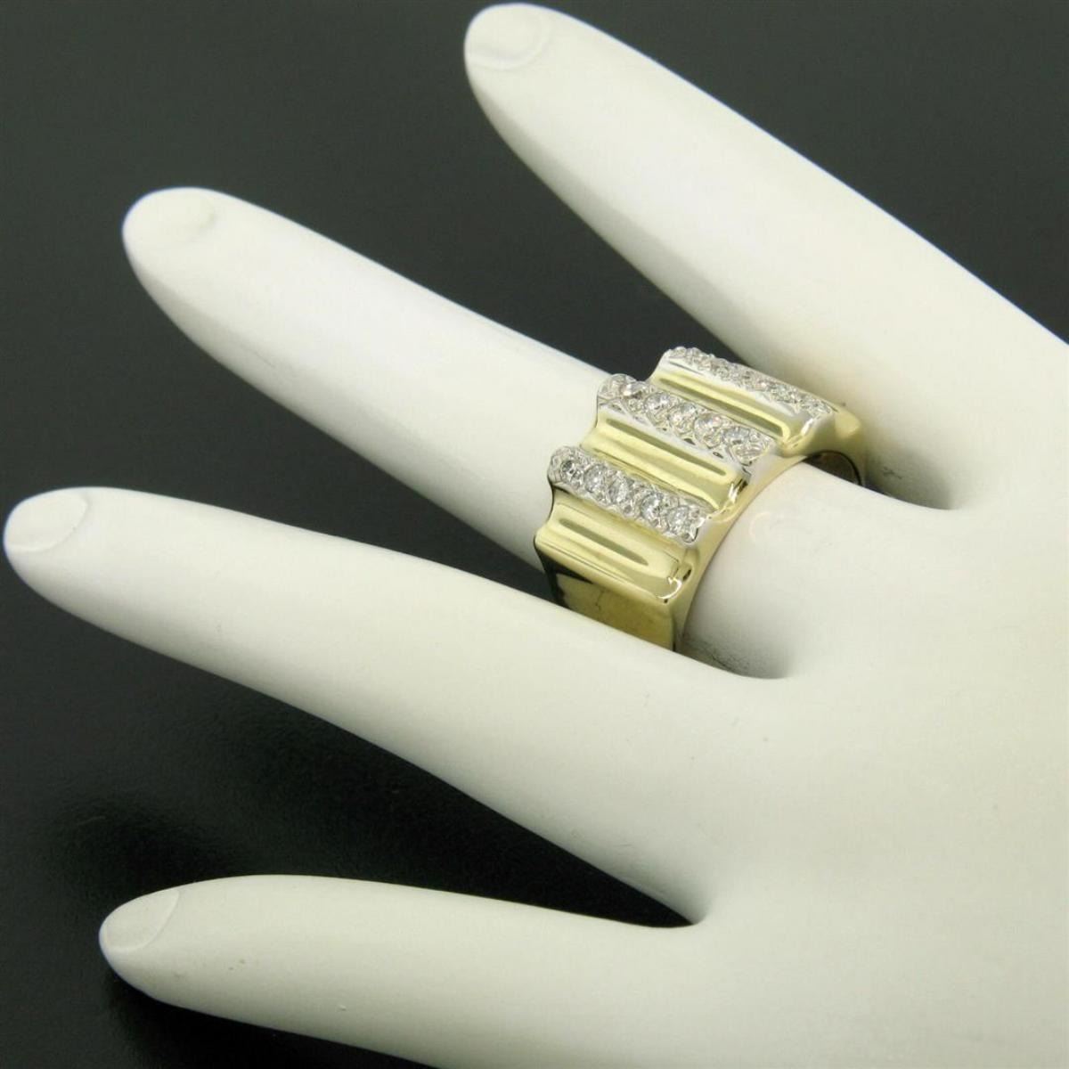 One Solid 14k Solid Yellow Gold Wide band ring with vertical grooved desgin. Measures 14.15mm wide and 3.6mm rise off the finger. 15 round diamonds total approx. 0.35ctw with VS1 clarity and G/H color. Weight is 9.20 grams.