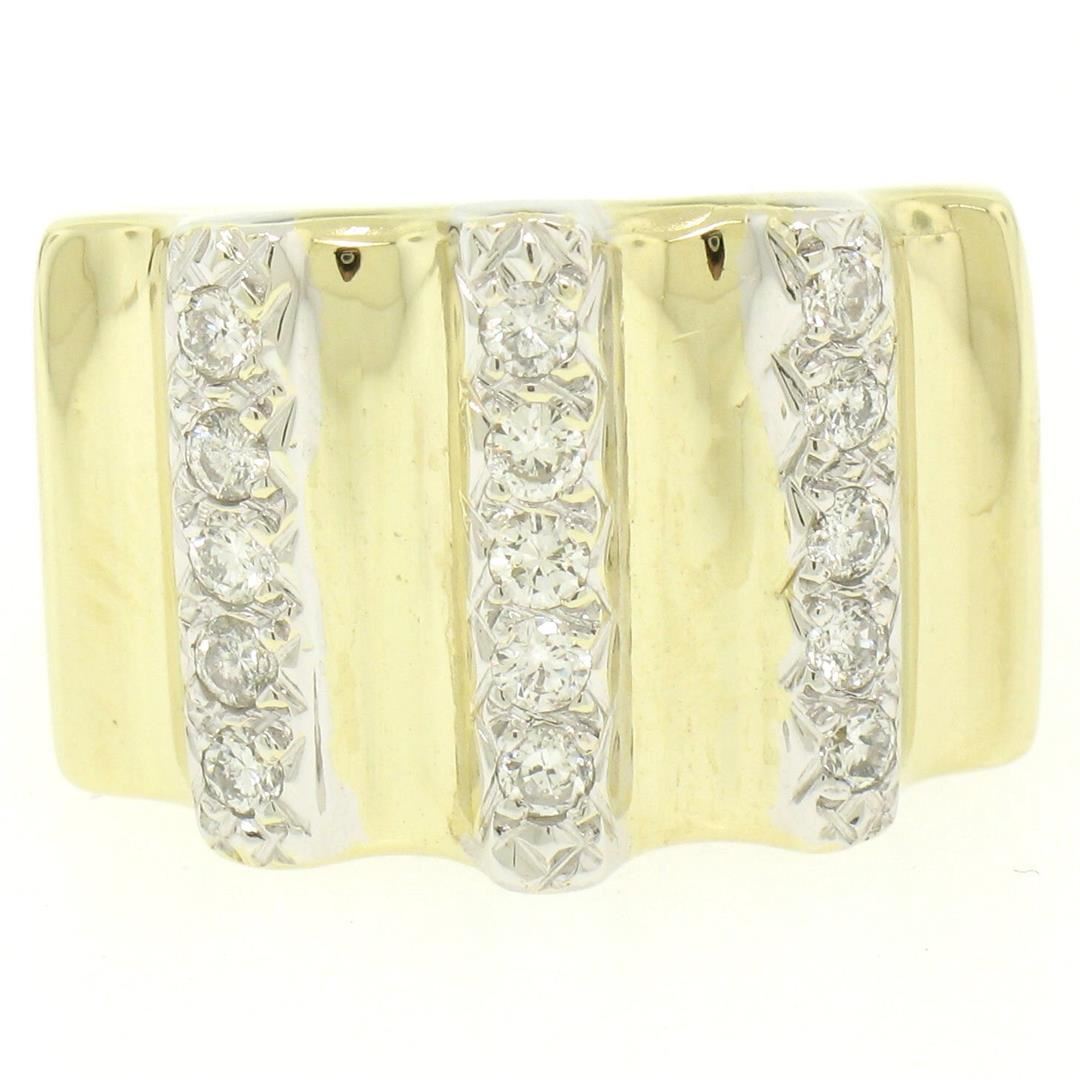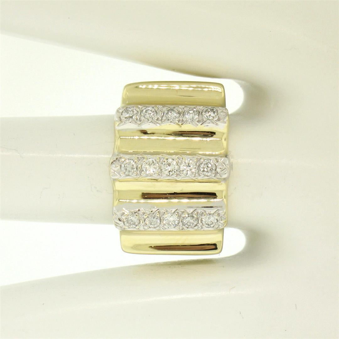 An estate solid 14k yellow gold wide band rinf with 15 round brilliant cut natural diamonds (G/H- 0.35ctw). The ring is size 7.5, weighs a total of 9.2 grams, and measures 14.15mm wide.