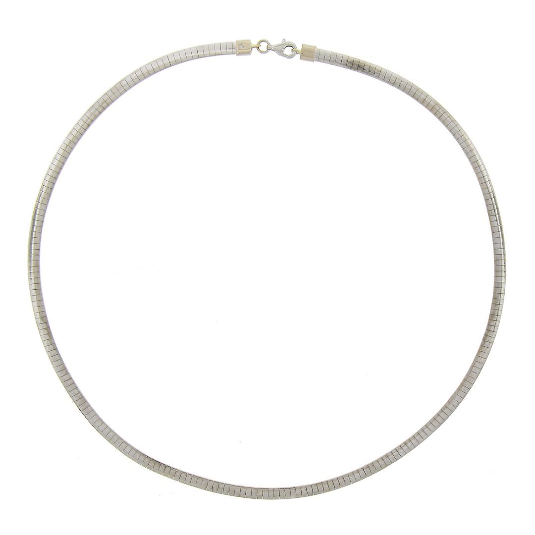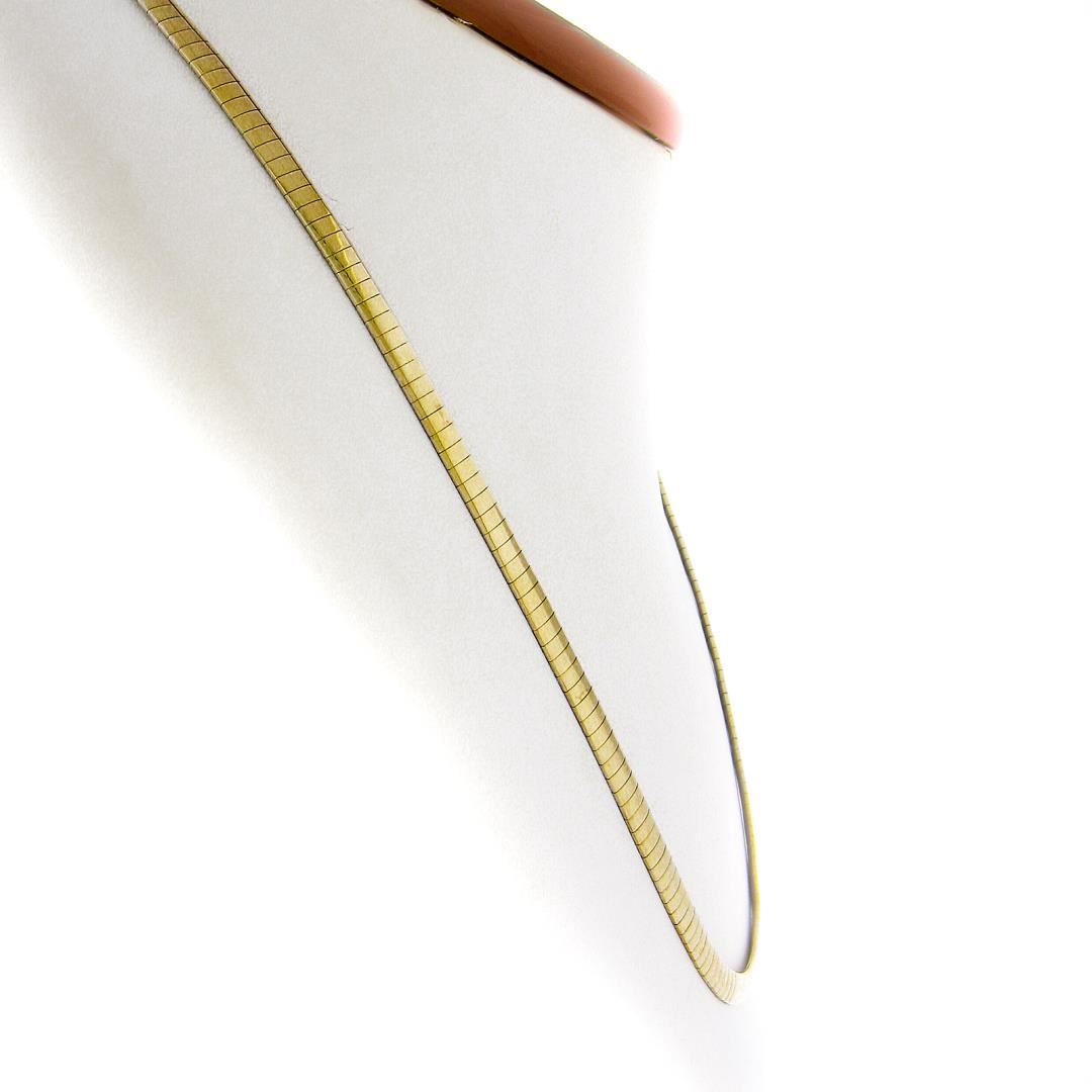 A solid 14k yellow & white gold reversible omega link necklace. It weighs a total of 19.27 grams, measures 3.8mm wide, and measures 18 inches in length.