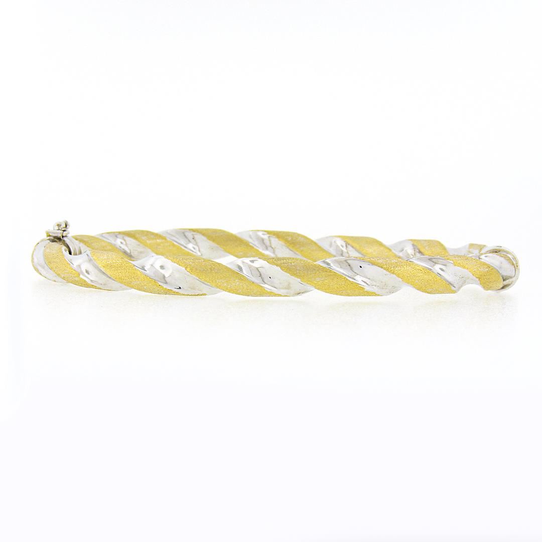 A solid 14k white & yellow gold twisted bangle bracelet. It weighs a total of 11.14 grams, measures 6mm wide, and measures 7 inches in length.