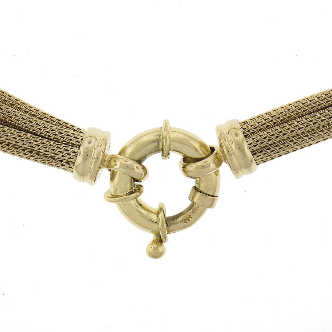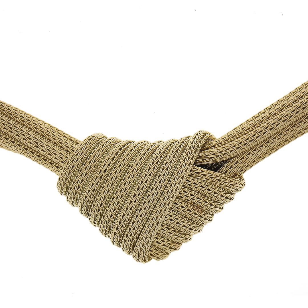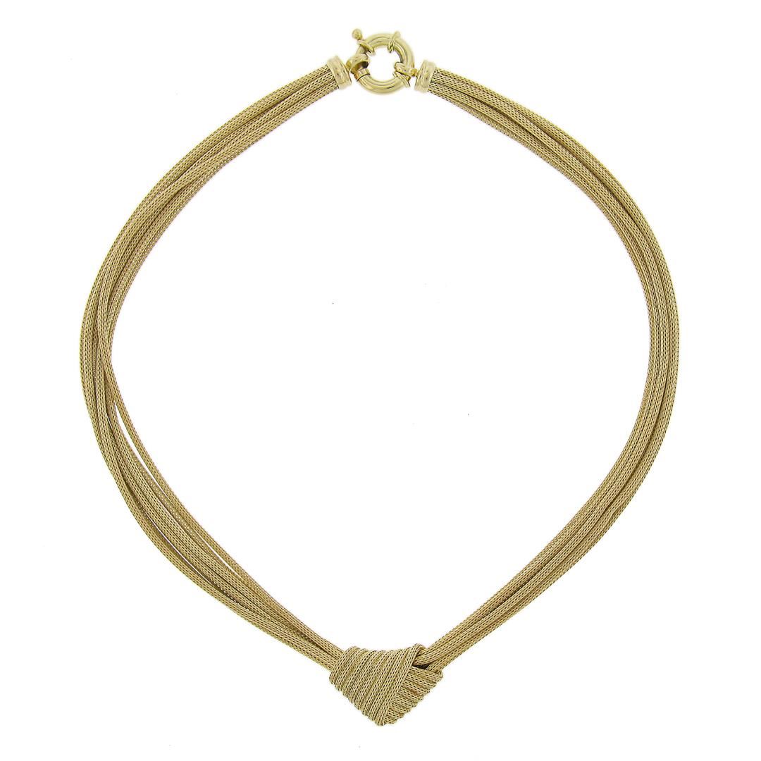 A solid 14k rosy yellow gold mutli strand knot necklace. 17 inch wheat link chain, 48.76 grams total weight.