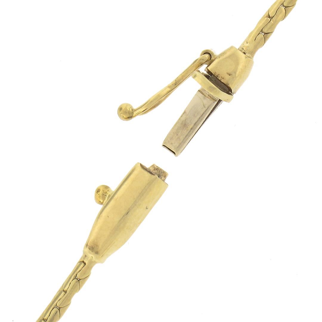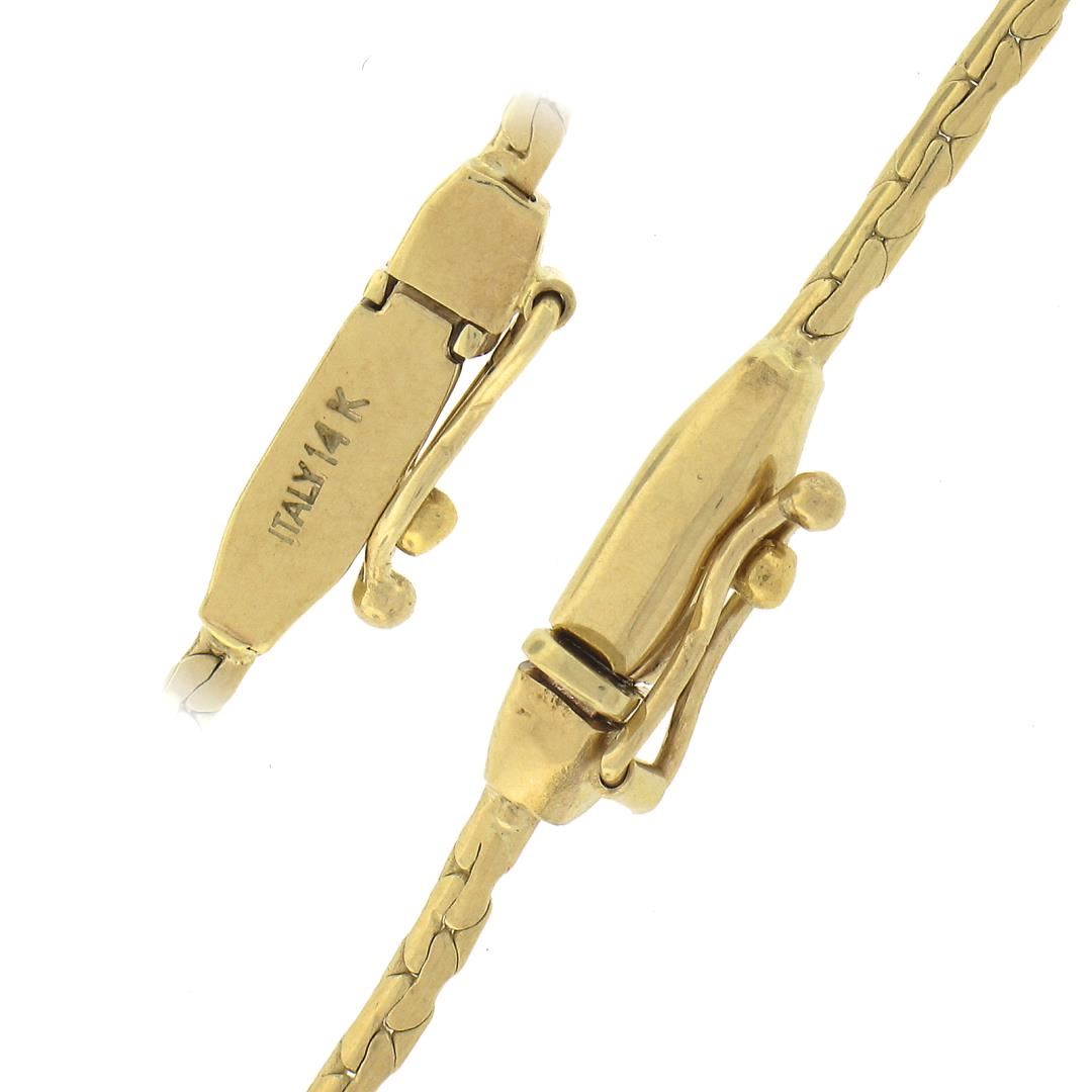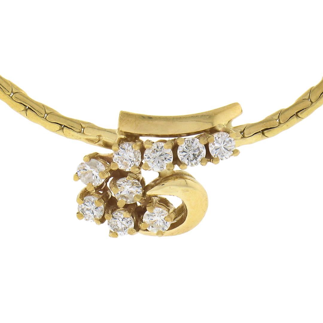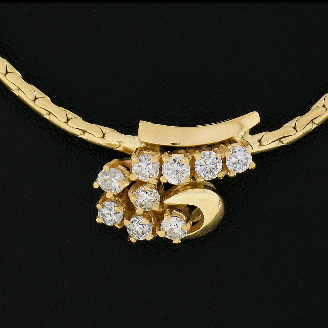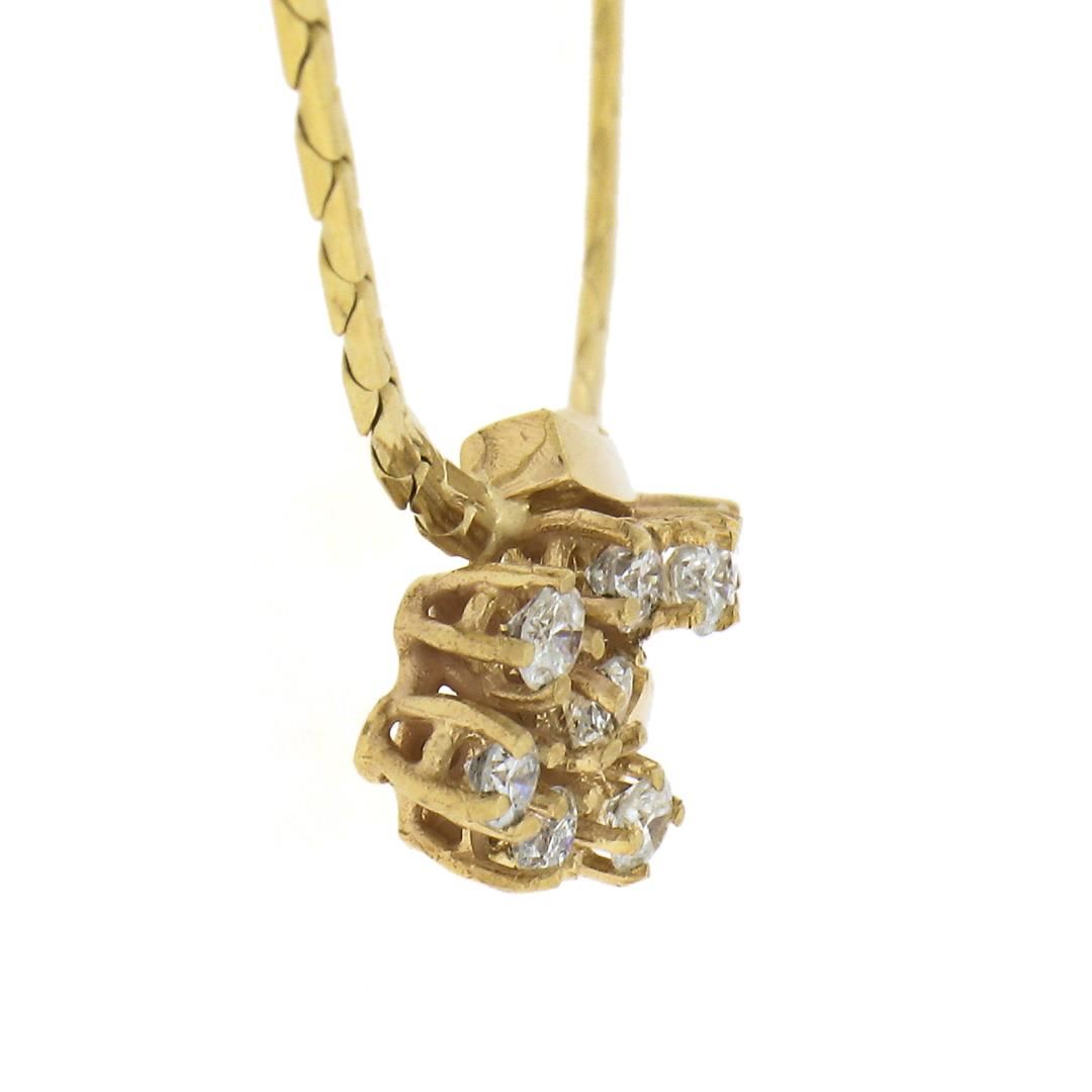 A solid 14k yellow gold necklace, with 9 round cut natural diamonds (H/I - SI2-I2 ; 0.35ctw). 16 inch flat wheat link chain, 7.67 grams total weight, pendant measures 10.2x13.6mm.