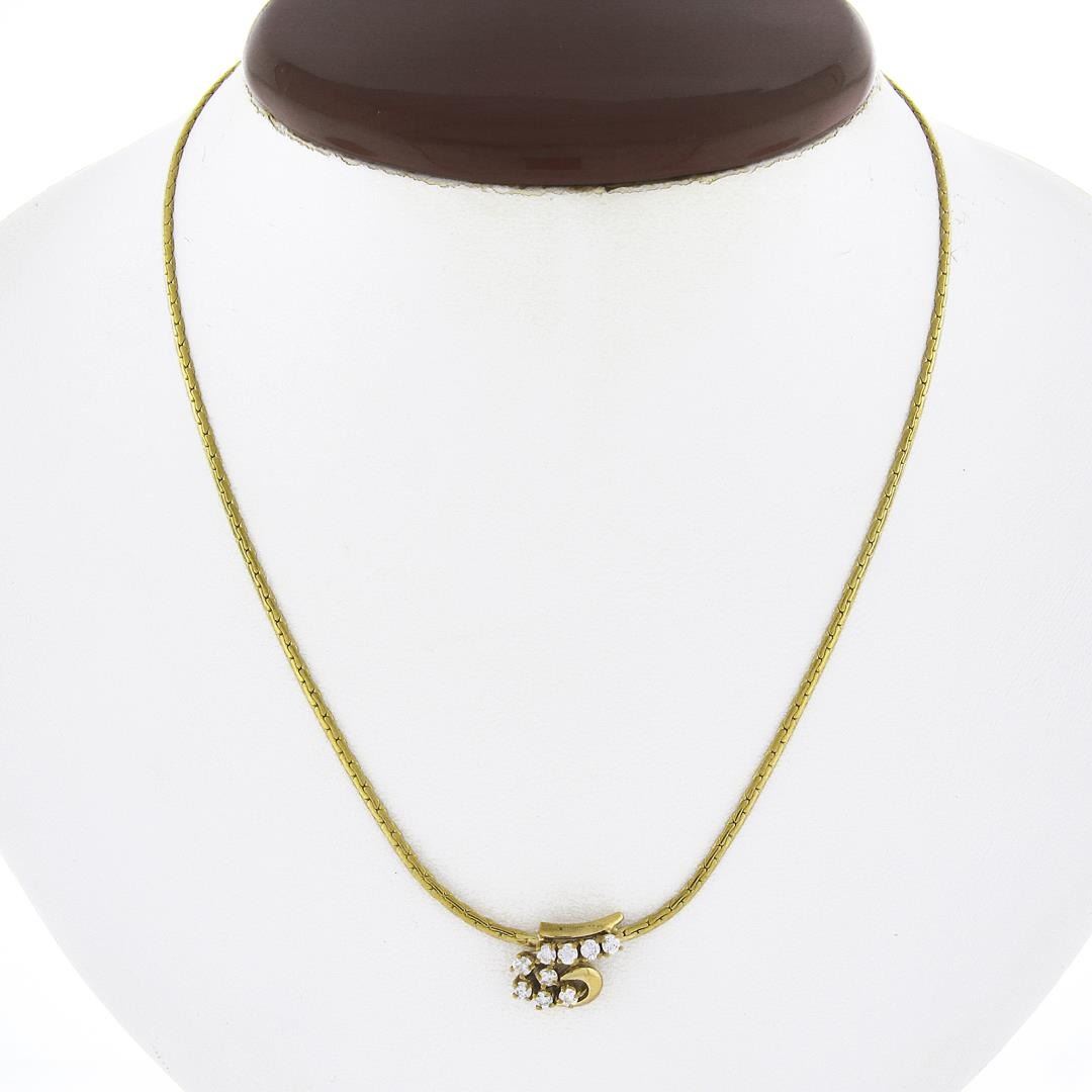 A solid 14k yellow gold necklace, with 9 round cut natural diamonds (H/I - SI2-I2 ; 0.35ctw). 16 inch flat wheat link chain, 7.67 grams total weight, pendant measures 10.2x13.6mm.